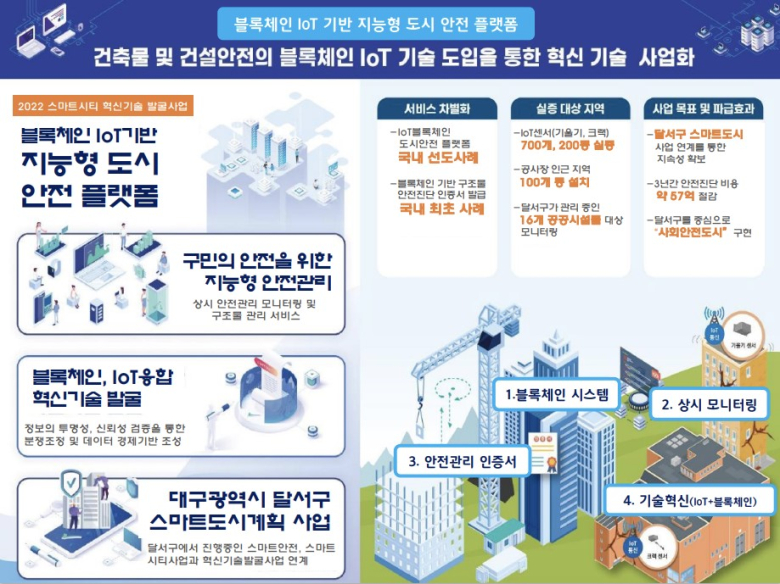 달서구는 '블록체인 IoT 기반 지능형 도시 안전플랫폼 구축'을 주제로 응모했으며 구조물 안전 환경 실시간 모니터링과 데이터 신뢰향상으로 스마트 안전도시를 구축하는 것이 목표다.