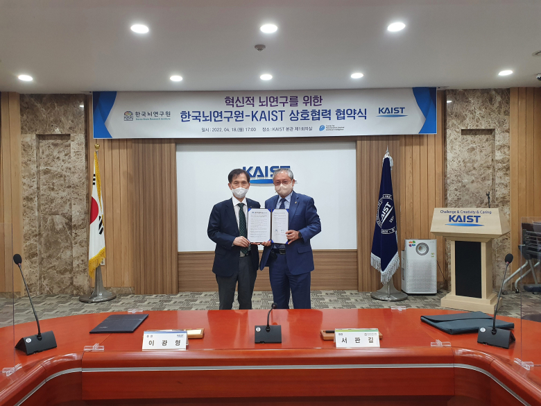 한국뇌연구원이 KAIST와 지난 18일 오후 카이스트 본관 제1회의실에서 혁신적 뇌연구를 위한 업무협약을 맺었다.양 기관은 협약을 통해 상호 유기적인 업무협력 체계를 구축해 공동연구협력 및 우수한 인재양성을 통한 뇌연구 분야의 역량을 강화키로 했다.구체적으로 ▲혁신적 뇌연구(뇌공학, 뇌질환, 뇌영상, 데이터과학 등) 관련 주제 발굴 및 공동연구 추진 ▲최신 뇌연구 인프라의 공동 활용 ▲뇌연구 전문인력 교류 및 양성 등에 다각적으로 노력을 기울인다.서판길 한국뇌연구원 장은 “인공지능을 기반으로 한 뇌 빅데이터 분석 및 검증 플랫폼 공동 개발을 추진할 계획"이라며 "적극적인 연구 및 전문 인재 공유와 협업을 통해 뇌연구 고도화의 초석을 함께 다지겠다”고 밝혔다.KAIST 이광형 총장은 “특성화 대학과 정부출연연구기관 간 상호 긴밀한 협력 체제를 구축하게 돼 기쁘다"며 "우수한 뇌연구 성과를 통해 국민 삶의 질 향상, 국가 경쟁력 강화, 국제적 위상 정립에 기여할 것”이라고 말했다.