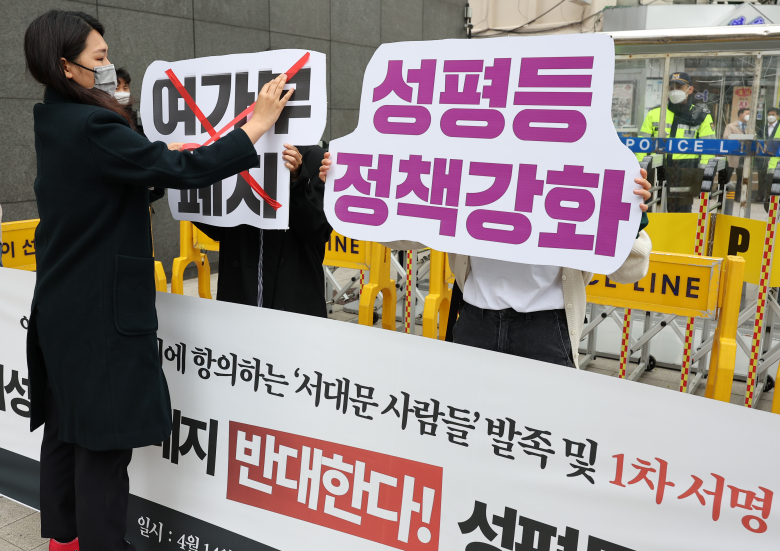 정부의 양성평등정책에 대해서는 '남성과 여성 모두의 입장을 대변한다'는 응답자 비율이 41%로 가장 높았다.'여성의 입장을 대변한다'는 응답자 비율은 29%, '남성의 입장을 대변한다'는 응답자 비율은 12%였다.특히 20대 남성의 51%, 30대 남성의 50%는 양성평등정책이 여성의 입장을 대변한다고 답했다.또 한국리서치가 이달 8∼11일 1천 명을 대상으로 설문 조사한 결과, 성별 불평등 해소를 위한 정책을 정부 주요 과제로 추진하는 데 대해 응답자의 76%가 동의하는 것으로 나타났다.양성평등정책 추진에 대한 필요성 인식은 높지만, 윤석열 정부에 대한 기대감은 낮았다.새로운 정부가 성평등정책을 못할 것이라는 응답자 비율은 48%로, 잘할 것이라는 응답자 비율(36%)보다 높았다.특히 20대 남녀의 평가가 극명하게 엇갈렸다. 20대 여성의 85%가 새 정부의 양성평등정책에 부정적 평가를 했다. 20대 남성은 26%가 부정적으로, 48%가 긍정적으로 전망했다.