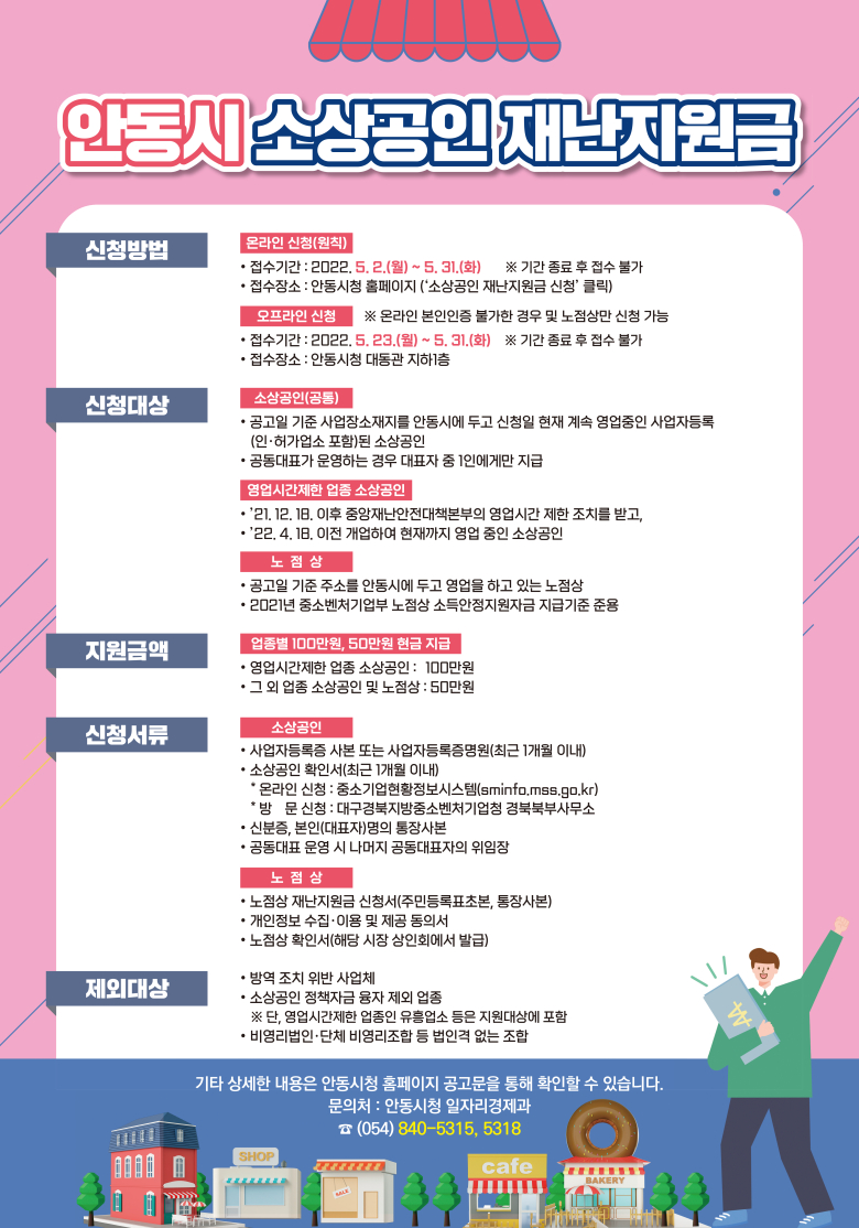 안동시는 코로나19 사회적 거리두기 방역조치 장기화로 피해를 입은 소상공인의 경영안정을 위해 ‘안동시 소상공인 재난지원금’을 지급한다.이번 재난지원금 대상은 이달 25일 기준 안동시에 사업장을 두고 신청일 현재 계속 영업 중인 사업자등록(인·허가업소 포함)된 소상공인과 2021년 중소벤처기업부 ‘노점상 소득안정지원자금’ 지급기준에 해당되는 노점상이 해당된다. ▲영업시간제한 업종 소상공인에 100만 원, ▲그 외 업종 소상공인과 노점상에 50만 원을 지원한다. 단, 영업시간제한 업종은 2021년 12월 18일 이후 중대본의 영업시간제한 조치를 받은 사업장으로 2022년 4월 18일 이전 개업하여 현재까지 영업중인 사업장이 신청 가능하다.신청기간은 내달 2일부터 31일까지이며, 신청방법은 안동시청 홈페이지‘소상공인 재난지원금 신청 바로가기’로 신청할 수 있다. 온라인 본인인증이 불가한 경우 및 노점상만 23일부터 31일까지 오프라인으로 신청이 가능하며, 안동시청 대동관 지하 1층으로 방문해서 신청하면 된다.신청 제외 대상은 방역조치 위반 사업체, 소상공인 정책자금 융자 제외 업종(단, 영업시간제한 업종인 유흥업소 등은 지원대상에 포함), 비영리법인.단체.비영리조합 등 법인격 없는 조합 등이 해당된다.신청서류는 소상공인은 사업자등록증 또는 사업자등록증명원(최근 1개월 이내), 소상공인 확인서(최근 1개월 이내), 신분증, 대표자 명의 통장사본 등이 필요하다. 노점상은 노점상 확인서, 주민등록표 초본, 통장사본 등이 첨부되어야 한다. 기타 상세한 내용은 안동시청 홈페이지 공고문을 통해 확인할 수 있다.한편, 대상자들이 최대한 빨리 신청할 수 있도록 소상공인 관련 유관 기관·단체.협회 및 읍면동, 시장 상인회 등에 안내 공문을 발송할 예정이며 다양한 홍보매체를 활용하여 적극 홍보할 계획이다. 권영세 안동시장은“코로나19 장기화에 따른 사회적 거리두기 방역 협조와 어려움을 감내한 소상공인 등을 보호하기 위해 재난지원금을 지급하기로 결정했다”며“이번 지원금이 매출 감소 등 경영난으로 힘든 시간을 견딘 사업주에게 조금이나마 보탬이 되길 바란다”고 말했다.