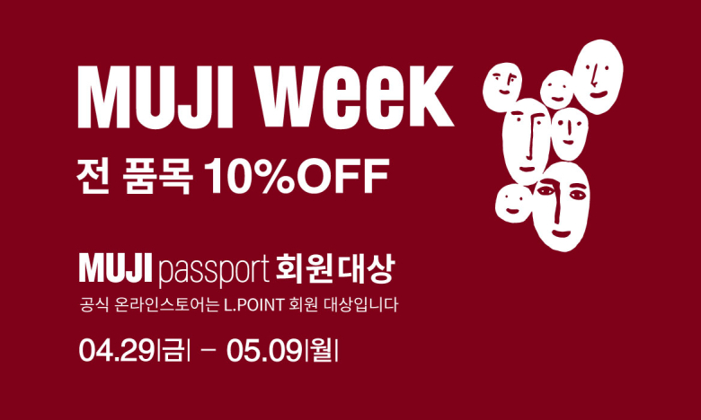 기분 좋은 생활을 제안하는 무인양품 주식회사가 전 품목을 10% 할인하는 연중 최대 고객감사 행사 ‘MUJI WEEK(무지위크)’를 오늘부터 5월 9일(월)까지 11일 동안 실시한다.‘MUJI WEEK’는 무인양품을 애용하는 고객과 처음 방문하는 고객 등 무인양품의 모든 고객을 대상으로 감사의 의미를 전하기 위해 기획된 이벤트다. 행사 기간 내 무인양품 온·오프라인 스토어에서 상품을 구입하는 모든 고객은 할인 혜택을 받을 수 있다.‘MUJI WEEK’에 참여하고자 하는 고객은 오프라인 매장 이용 시 무인양품 공식 앱 ‘MUJI Passport’를 다운로드 받은 후 결제 시 계산대에서 앱을 제시하면 전 품목 10% 할인을 받을 수 있다. 단, 이트인(Eat-in) 카페 음료, 자수 서비스, 로컬푸드 제품은 할인 제외 대상이다. 무인양품 공식 온라인 스토어(자사몰, 롯데온)를 이용하는 경우 L.POINT(엘포인트) 통합회원 로그인 후 할인 쿠폰을 다운로드 받아 결제 단계에서 적용하면 된다. 쿠팡 직영몰과 네이버 스토어는 결제 시 자동으로 할인가가 적용된다.이번 행사에서 주목할 만한 상품은 ▲프렌치 리넨 워싱 셔츠(39,900원→35,910원) ▲산뜻한 면 이너웨어 시리즈(9,900원→8,910원) ▲선풍기(저소음팬·대풍량타입)(139,000원→125,100원) ▲면 파일 페이스 타월(4,900원→4,410원) ▲오늘 새로 출시가 된 재료의 맛을 살린 블록국 시리즈(미네스트로네 수프, 튀긴 가지&시금치 미소 된장국, 버섯&치킨 포르치니 포타주 수프)(각 5,500원→4,950원) 등 의류, 생활용품, 식품류로 다가오는 여름철 유용하게 쓰일 수 있는 품목들이다.무인양품의 영업기획팀 전대환 팀장은 “이번 MUJI WEEK를 계기로 더 많은 분들이 무인양품을 접하고 지속 가능한 상품개발을 향한 무인양품의 신념과 가치를 체감해 보셨으면 좋겠다”며 “앞으로도 창립 이래 변함없이 지켜온 생산과정의 간소화, 소재의 선택, 포장의 간략화라는 3가지 상품개발 기본원칙을 통해 고객의 생활과 사회에 도움이 될 수 있도록 노력할 것”이라고 말했다.한편 무인양품은 작년 8월 825개 생활용품 가격의 하향조정을 통해 고객 생활 속 의·식·주 용품을 보다 구매하기 쉽도록 혜택의 폭을 넓힌 바 있다.