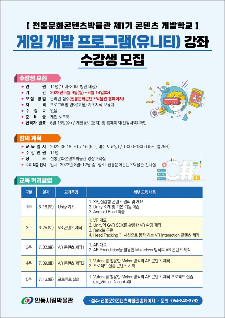 안동시립박물관(관장 이희승)은 실감콘텐츠 제작(AR, VR)에 관심 있는 청년을 대상으로 이달 9일부터 내달 14일까지 ‘제1기 콘텐츠 개발학교’수강생을 모집한다.‘제1기 콘텐츠 개발학교’는 실감콘텐츠를 제작할 수 있는 프로그램인 ‘유니티(Unity)’를 교육한다. 유니티(Unity)는 AR·VR 분야를 선도하는 실시간 인터랙티브 3D 콘텐츠 개발 및 운영 플랫폼으로서 게임뿐만 아니라 영상, 엔터테인먼트, 자동차, 건축, 전시 등 다양한 분야에서 활용 가능하며, 최근 메타버스를 조성하는 엔진으로도 주목받고 있다.이번 교육은 유니티의 기초이론 강의를 시작으로 안동의 전통문화를 활용한 AR·VR콘텐츠 제작, 프로젝트 실습과정 순으로 진행된다. 교육 완료 후 수강생이 완성한 작품은 전시로 활용할 예정이다.교육기간은 5주간(6월 18일~7월 16일)이며 매주 토요일 13시부터 18시까지 전통문화콘텐츠박물관 영상교육실에서 진행된다.신청자격은 프로그래밍 언어(코딩) 기초지식을 보유한 청년(10대~30대)이라면 누구나 신청이 가능하다.교육 참여 신청은 전통문화콘텐츠박물관 홈페이지(https://www.andong.go.kr/tm/main.do) 에 있는‘박물관대학 신청’란에서 가능하다. 자세한 사항은 안동시립박물관 학예연구팀(054-840-3762)으로 문의하거나, 전통문화콘텐츠박물관 홈페이지에서 확인할 수 있다.
