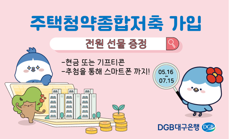 DGB대구은행이 16일부터 주택청약종합저축을 가입하는 고객을 대상으로 현금이나 기프티콘을 전원 증정하는 ‘주택청약 가입하기 좋은날’ 이벤트를 진행한다.