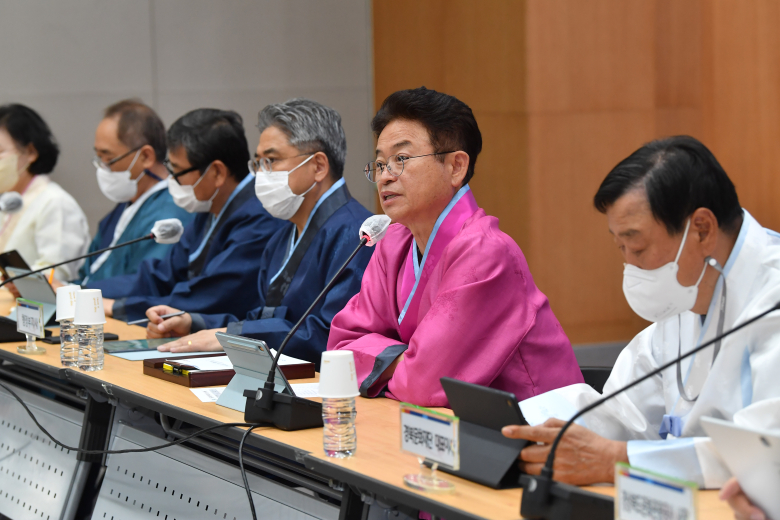경북도가 단오 날인 지난 3일 간부회의와 7일 확대간부회의에서 실국장을 비롯한 출자·출연기관장들이 한복을 입고 회의를 진행, 한류 실천에 직접 나섰다.이번 두 번의 간부회의는 민선 8기 경북도가 나아가야 할 방향을 공유하고 새로운 경북도정에 대한 동기부여와 내부결속, 그리고 새로운 각오를 다지고자 마련됐다. 이는 변화와 혁신을 향해 달려온 민선 7기를 잘 마무리하고, 새 정부 출범으로 신지방화 시대를 맞아 우리 전통복식인 한복의 아름다움을 알리고 일상화를 통해 세계화하겠다는 경북도의 의지를 나타낸 것이다.또 한글, 한옥, 한식과 더불어 K-컬처의 핵심콘텐츠인 한복의 일상화를 통해 경북도가 신 한류를 선도하겠다는 굳은 의지를 담아 참석자 전원이 한복을 착용했다. 이날 새롭게 선보인 한복근무복은 경북의 정체성이 담긴 실용적이고 세련된 근무복 도입을 위해 지난달 중순까지 진행된 ‘2022 경상북도 한복근무복 디자인 공모전’을 통해 선정됐다.선정된 한복근무복은 현대적인 감각과 해석으로 일상복으로 재탄생됐으며, 정월대보름날ㆍ단오날ㆍ한글날ㆍ한복의 날(10월 21일), 확대간부회의 등 중요한 날에 착용한다. 이를 통해 한복의 우수성과 가치를 드높이고, 한복이 일상복으로 자연스럽게 스며들어 그 아름다움을 문화산업으로 발전시켜 나간다.경북은 훈민정음 해례본인 간송본과 상주본이 발견됐고, 전통음식 3대 옛 요리책 수운잡방, 음식디미방, 온주법이 저술됐으며, 한옥마을인 하회마을과 양동마을의 유네스코 세계문화유산에 등록된 고장이다. 또 한복 주요소재인 상주의 명주(국내 총생산량의 95%), 영주의 인견(국내 총생산량의 85%), 안동의 삼베(국내 총생산량의 80%) 등의 전통섬유산업의 기반을 보유하고 있다. 도는 이를 기반으로 하는 K-컬처(한글, 한식, 한옥, 한복) 종주 지역으로서 한복산업의 메카로 자리매김하기 위해 한국한복진흥원(상주 함창)을 통해 한복문화주간, 한복문화 지역거점 지원 사업, 전통복식산업 활성화 지원 사업 등을 추진하고 있다.특히, 올해 상반기 문화체육관광부의 한복관련 공모사업에 2개 사업이 선정되는 성과도 올렸다. 먼저, 2022년 지역 한복문화 창작소 조성 사업을 통해 상주상의원이라는 경북형 한복문화 창작소를 조성하고, 도내 초중고 50여개 학교에서 한복문화 교육을 운영한다. 또 2022 패션디자이너 역량강화 지원 사업(국비 1.4억원)을 통해 한복 전통패션 디자이너 양성을 위한 ‘新 한복쟁이 발굴 프로젝트’를 추진한다.도는 향후에도 ‘일상 한복 세계화 선도 프로젝트’를 통해 4차 산업혁명시대의 메타버스 기술을 이용해 전 세계에 가상 한복체험 서비스를 제공한다.이철우 경북도지사는 “한복이 갖고 있는 품격과 아름다움에 전 세계가 감동할 수 있도록 각종 회의나 행사 때마다 한복을 즐겨 입겠다”며, “한복이 명실상부한 신 한류 핵심콘텐츠로 자리매김할 수 있도록 경북이 그 중심에서 선도적으로 나서겠다”고 거듭 밝혔다.