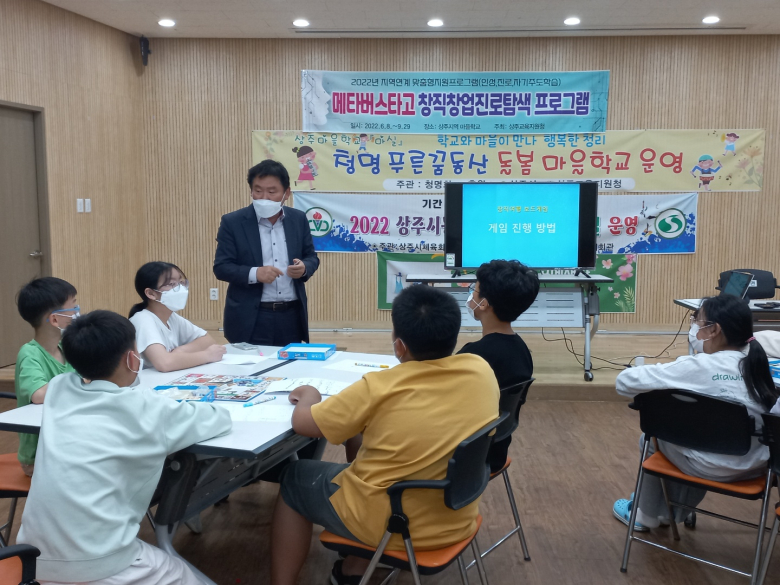 경상북도상주교육지원청(교육장 김종윤)은 지난 13일부터 9월 말까지 상주지역 9개의 마을학교를 대상으로 함께 성장하고 소통하는 지역연계 맞춤형 지원 프로그램을 운영한다. 이 프로그램은 청소년 인성교실, 진로교실, 자기주도학습교실과 샌드아트 공연을 보고 직접 체험도 해보는 샌드아트 교실, 상주지역의 농산물을 이용한 요리교실 등으로 이뤄져 있다. 각 마을학교 또는 초, 중학교에서 희망을 받아 운영되며 각 마을학교로 강사를 파견하여 프로그램이 진행된다. 청소년 자기주도학습교실은 스스로 공부하는 방법과 습관을 길러 코로나19로 인해 저하된 기초학력을 향상시키기 위해 마련된 프로그램이다. 청소년진로교실에서는 메타버스를 활용하여 미래의 직업과 진로에 대한 트렌드를 살펴보고, 미래조감도를 통해 미래 직업을 창조하고 사회 공동의 문제를 함께 해결해 나가는 계기를 제공하고자 한다. 청소년 인성교실은 함께 해결해 나가는 미션을 통해 함께 행복을 만들어 나가는 경험을 제공한다. 인성교실에 참여한 모동마을학교 한 어린이는 “친구들과 함께 미션을 수행하면서 서먹했던 친구를 이해하고 되고 완성된 작품을 보면서 내가 정말 자랑스러웠다.”며 자신의 결과물을 뿌듯하게 내보였다. 상주교육지원청 김종윤 교육장은 “초롱초롱한 눈망울로 열정적으로 프로그램에 참여하는 아이들을 보면 힘이 솟는다. 우리 모두의 아이들을 위해 열악한 환경 속에서도 수고를 마다하지 않는 마을교사들께 또 한 번 감사의 마음을 전한다. 인성, 진로, 자기주도학습 등 마을학교별 맞춤형 지원을 통해 마을학교 사업이 좀 더 풍성해지는데 조금이나마 도움이 되었으면 좋겠다.”고 했다.