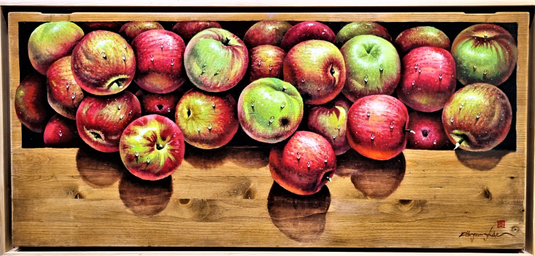이번 전시에서는 자두나 사과 등의 ‘싱싱한 과일’을 주제로 한다. 작품들은 목판에 혼합재료(아크릴, 유화)로 그려 관객들에게 내적 시원함까지 선사한다.