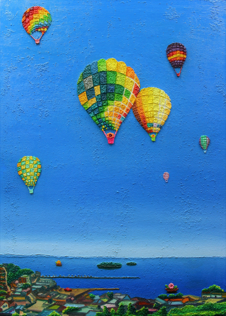 작품에 등장하는 마을과 자동차, 논, 밭, 열기구, 벚꽃, 구름 등은 일상을 넘은 현실 속에서 새로운 공간을 창출한다.