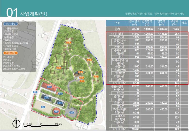성주힐링승마체험장은 1단계 사업으로 총사업비 38억을 들여 클럽하우스, 원형마장, 옥외승마장 등 공공 승마장으로 조성하고 차후 2단계 사업으로 승마교육센터, 외승로, 포레스트어드벤처, 캠핑장 등 다양한 말 문화시설을 조성해 사업을 순차적으로 추진해나갈 예정이다.
