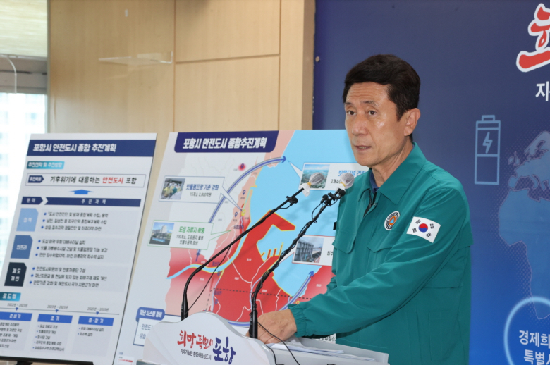 가장 먼저 ‘안전도시 대전환을 위한 종합계획 수립’과 관련 ▲대한민국 최고수준의 전문가들로 구성된 용역진, 포스코 등 기업과 시민이 참여해 방재계획을 수립하기 위한 용역을 실시하고 ▲냉천, 칠성천 등 하천이 범람해 피해가 큰 지역의 재발 방지를 위한 항구적인 지구단위 종합복구계획을 수립하며 ▲대송면, 청림동, 동해면 등 상습 침수지역에 대한 정밀진단 및 이주대책을 추진할 방침이다. 이어 ‘새로운 기준의 스마트 재난안전 인프라’ 구축을 위해 ▲도심 인근 산악지대의 빗물로 인한 하천 범람과 도심 주거지역과 국가산단 침수 피해를 막기 위해 외곽 해안지역으로 빗물을 배출하는 총연장 28㎞의 ‘도시 외곽 우회 대배수터널’ 설치 ▲연안 침수위험지역과 하천 하류지역의 침수를 막을 총연장 60㎞의 차수벽 설치 ▲빗물 수용 능력을 향상할 도심 저류지 확충 및 빗물펌프장 기능 개선 등 방재 정책의 대전환을 추진한다. 이와 함께 ‘시민 안전중심의 제도개선 및 강화’를 위해서는 ▲민관이 함께 안전정책을 총괄하는 안전도시위원회 및 전문자문단 구성 ▲재난지원금 등 불합리한 피해구제 제도 개선 ▲포항, 울산, 부산 등 기후위기에 취약한 해안도시에 대한 국가 지원근거 마련을 위한 특별법 제정 건의와 지하주차장 등에 대한 안전기준 강화 등을 추진한다. 이강덕 시장은 “기후 변화 시대 잦아지고 강력해지는 자연 재난에 근본적으로 대비하는 방재정책의 대전환을 통해 시민과 기업이 안심할 수 있는 안전도시 포항을 만들겠다”고 말했다.