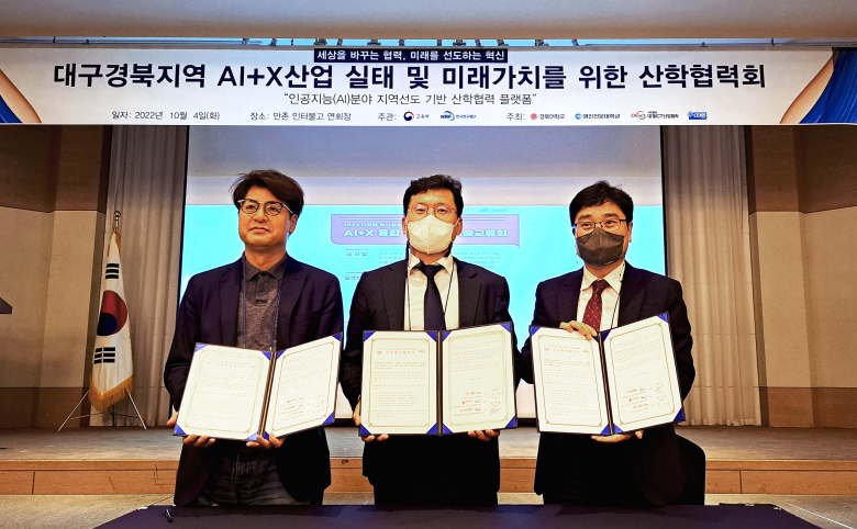영진전문대학교 인공지능혁신공유대학사업단이 지난 4일 대구 호텔인터불고에서 경북대학교 인공지능사업단, 대경ICT협회와 함께 대구·경북 지역 AI+X 산업 실태 및 미래가치를 위한 산학협력기술교류회를 가졌다. 이번 산학협력기술교류회는 AI+X 융합기술 현황과 지역산업 현안을 공유하고 산학협력을 위한 아젠다 발굴을 통해 지역 대학을 중심으로 산학협력 모델 실현에 힘을 모았다.또 ▲인공지능 기술 분야 산·학 협력 컨설팅 프로세스 구축 ▲기업체 공동연구안 제안 및 산학협력 프로젝트 킥오프(Kick Off) ▲지역 인재 유치를 위한 인턴, 취·창업을 위한 인공지능 혁신공유대학 온라인 플랫폼 개발안이 제시됐다.영진전문대, 경북대와 인공지능혁신공유대학 참여 대학은 공동으로 인공지능산학협력 플랫폼을 마련해 산업현장 문제를 산업체와 공동 발굴하고 이를 교육과정에서 해결하는 프로젝트를 추진해 AI기업과 상생협력 생태계를 구축하는데도 노력하기로 뜻을 모으고 산학협력 협약을 맺었다. 김종규 단장은 “산학의 실질적인 교류·협력을 통해 배출되는 실용 우수 인재를 지역에 유치하는데 지속적해서 기여할 것”이라고 말했다.