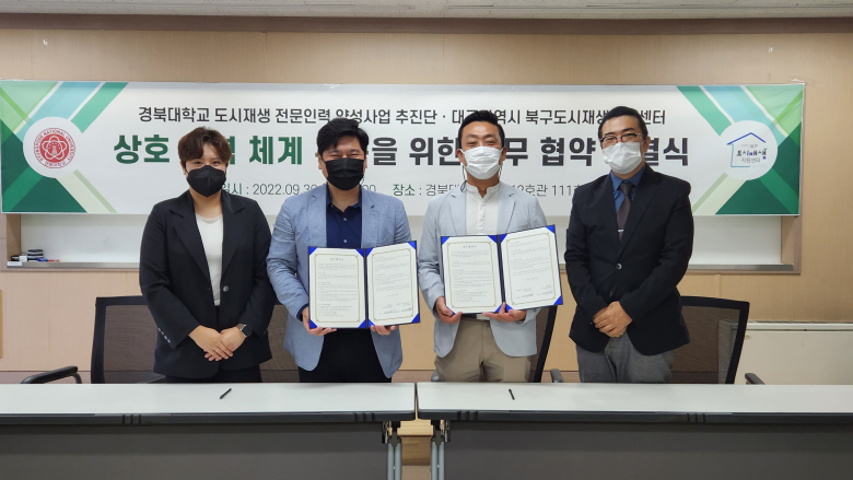 북구는 침산1동 도시재생 뉴딜사업(자연을 담고 마음을 나누는 ‘침산에 반하다’)을 시작으로 복현1동 도시재생 뉴딜사업(피란민촌의 재탄생 ‘어울림 마을 福현’), 산격3동 도시재생 뉴딜사업(청년 문화와 기술의 융합 놀이터 ‘경북대 혁신타운’)을 추진하고 있으며 관음동 도시재생 본사업 선정을 위해 활발하게 준비하고 있다.경북대 도시재생 전문인력 양성사업단은 국토교통부에서 선정한 도시재생 분야 융·복합 인재를 양성하는 도시재생 전문인력 양성대학으로 지역 특화 석·박사 프로그램을 수행하고 거버넌스를 통해 도시재생에 대해 수준 높은 노하우를 축적해온 지역 거점 대학이다.북구 관계자는 "이번 협약을 시작으로 변화된 도시재생사업에 대한 지역민들의 효능감을 향상시키고 지속 가능한 다양한 활동들을 적극적으로 이행해 나가게 될 것으로 기대된다"고 말했다.