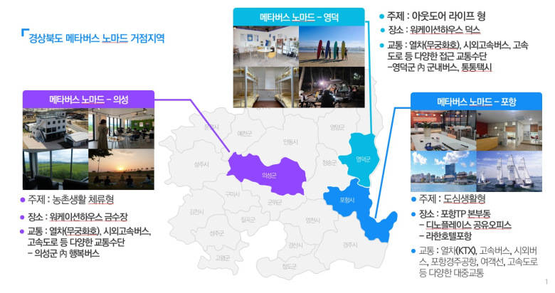 경북도 내 포항시와 의성군, 영덕군이 과학기술정보통신부와 정보통신산업진흥원이 주관하는 '메타버스 노마드' 시범사업 운영기관 모집 공모에 최종 선정됐다.메타버스 노마드는 메타버스를 기반으로 근무 장소에 구애받지 않고 멀리 떨어져 있는 동료와 소통하고 일을 처리하는 사람을 말한다.이번 공모사업은 지역 유휴 공간을 활용해 원격근무 환경을 조성하고, 지리적 한계를 넘어 효율적이고 생산적인 메타버스 업무 문화 확산을 목표로 추진되는 시범사업이다. 경북도에 따르면 포항시, 의성군, 영덕군이 함께 참여하고, 포항TP 경북SW진흥본부가 주관기관으로, 메이드인피플이라는 기업이 참여해 지역의 자원과 연계한 체험프로그램 제공으로 놀면서 일하는 메타버스 노마드(Metaverse-workcation)를 올 연말까지 시범운영한다. 경북도는 도시와 농·어촌생활 융합 전략으로 도심생활형, 농촌생활 체류형, 아웃도어 라이프형 노마드 근무환경을 제공한다.특히, 참가자가 원격근무 시 메타버스형 협업 솔루션을 직접 체험하고 회사업무에 활용할 수 있는 인프라 환경을 제공할 예정이다.먼저, 포항시의 도심생활형은 포항TP와 라한호텔 등에 메타버스 노마드 근무공간 및 주거공간을 제공하고, 딩기요트, 서핑, 카약체험 등 다양한 체험프로그램을 운영할 계획이다.의성군의 농촌생활 체류형은 이웃사촌시범마을사업과 연계, 청년게스트하우스를 활용하여 농촌지역의 다양한 체험프로그램인 로컬다이닝, 수제맥주 양조 체험 등을 운영한다.또 아웃도어 라이프형인 영덕군에서는 워케이션하우스를 활용해 근무환경과 숙박을 제공하고, 바다와 산 등 자연을 즐길 수 있는 일몰 트레킹, 캠핑 등을 연계한 체험프로그램을 제공할 예정이다.한편, 과기정통부는 올해 사업을 바탕으로 지역과 참가기업 만족도 및 사업성과를 바탕으로 내년부터 메타버스 노마드 사업을 확대한다는 입장이다.이에 도는 이번 시범사업을 마중물로 지역의 유휴자원을 발굴하고 체험 및 관광프로그램을 패키지 형태로 개발해 경북의 강·산·바다를 활용한 메타버스 노마드 근무환경을 조성해 참여기업들의 만족도를 높여가고 메타버스 문화 확산에 박차를 가할 방침이다.이철우 경북도지사는“시대 흐름에 따라 변화하는 새로운 오피스 트렌드에 맞춘 메타버스 노마드 환경의 표준을 경북도가 만들어가겠다”며 시범사업의 성공적인 추진의지를 밝혔다.