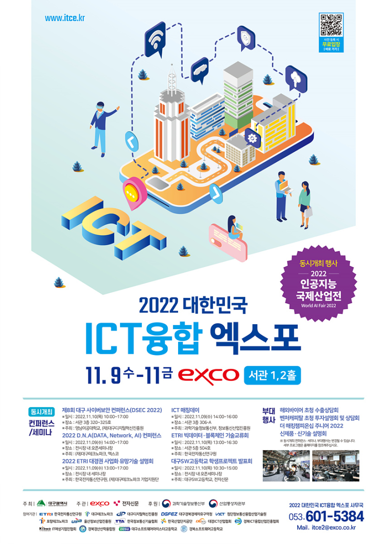 또 오션라이트AI, 엠엔비전, 주식회사 에이엘아이 등도 인공지능 및 디지털전환(DX)의 핵심 기술을 전시해 지역의 ABB산업을 선도한다는 각오다.올해는 특별한 컨퍼런스로 지역의 IT 인재를 찾아간다. 경북ICT융합산업진흥협회가 주관하는 ‘ICT 매칭데이’에서는 지역의 예비 취·창업자들에게 ICT 관련 기술과 창업 노하우를 공유하는 네트워킹 시간을 마련하고 ICT 혁신기술 및 산업 현황 등의 다양한 정보를 제공할 예정이다.이밖에 ABB산업 관련 다양한 컨퍼런스도 준비되어 있다. 산업 연계 AI 기술을 주제로 인공지능 기술과 결합된 의료기술, AI 기반 자율주행 모빌리티 서비스 운영사례, 업무 혁신을 위한 AI 기술 활용 사례, 인공지능 번역 성능 향상을 위한 데이터 구축 등 ‘인공지능 국제컨퍼런스’가 개최돼 전시회를 더욱더 풍성하게 할 예정이다.계명대학교 인공지능 융합연구소의 ‘AI 융합 심포지엄’도 3층 회의실에서 개최될 예정이다. NHN DATA 이진수 대표, LG AI Research 김승환 상무 등 각 분야의 핵심 인사들은 인공지능 관련 최신 트렌드와 응용기술 적용 사례를 발표하며 실현 가능한 인공지능 기술의 미래와 ABB산업의 발전방향을 공유할 예정이다.전시장 내에 마련된 사이버 보안존에는 안랩, 지란지교데이터, 링크넷코리아, 이글루코퍼레이션 등이 정보보안 관련 최신 기술을 선보이고 제8회 대구 사이버보안 컨퍼런스에서는 사이버 팬데믹 보안 위협에 대응하는 대구를 주제로 지역의 ICT 현안들과 연관된 사이버보안 관련 이슈들을 다루어 미래 첨단도시 대구를 보다 안전하고 스마트하게 만들어 가는 발판을 마련할 예정이다. 국내 D(Data).N(Network).A(AI) 전문가들이 초빙된 DNA컨퍼런스에서는 지역의 D·N·A 산업 발전 방향을 모색하고, ETRI 사업화유망기술설명회를 통해 사업화유망기술 소개 후 기술상담, 기술이전 등 기업 지원 방안을 설명한다. 이번 전시회에서는 중국, 베트남, 동남아 등 해외 바이어 50개 사를 초청해 진행하는 온·오프라인 수출상담회를 비롯해 올해 처음으로 참가하는 경북ICT융합산업진흥협회는 경북 대표 ICT 기업들의 기술 및 성과를 보여주고, 한국지능정보사회진흥원, 한국전자통신연구원, 대구테크노파크, 대구디지털혁신진흥원, 첨단정보통신융합산업기술원, 포항테크노파크, 울산정보산업진흥원 등이 공동관으로 참가하여 국내 ICT융합 분야 지원 성과와 R&D 관련 기술을 공유하는 등 전시회를 더욱 풍성하게 구성한다.홍준표 대구시장은 “대구시 5대 미래산업의 하나인 ABB산업을 집중 육성하기 위해 많은 투자를 하고 있다”며, “이번 전시회를 통해 참가기업들이 ABB산업을 적극적으로 개척해 대구 미래 50년을 만들어 가는 데 힘을 보태주길 희망한다”고 말했다.