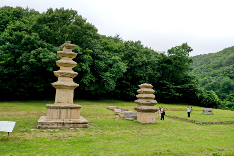 서탑인 5층 석탑은 금당터에서 서남 방향으로 약 15m 거리를 두고 있다. 그리고 동탑은 계곡에 무너진 상태로 흩어져 있던 것을 수습해 금당터와 서탑 사이에 부재를 모아 쌓아두고 있다. 서탑은 1925년 일제강점기 때 도굴범이 탑 속에 있는 사리장치를 빼내기 위해 폭파해 파괴됐던 것을 1932년 복원하고 보수해 현재의 모습으로 다시 세워졌다. 탑은 이중의 기단 위에 통일신라 양식의 전형적인 특징을 갖추고 있으며 높이가 약 9m에 이른다. 토함산으로 가는 계곡길에서 바라다보면 그리 커 보이지 않지만 계곡을 건너 절터에 들어서면 탑의 위용이 오롯하게 드러난다. 현재 파괴된 채 그대로 남아 있는 동탑도 부재로 미뤄 보면 서탑과 규모가 같은 5층탑이었던 것으로 추정된다.서탑의 첫째 층은 중앙에 문 모양의 문비와 자물쇠, 사자머리 장식 문고리가 새겨져 있다. 그리고 그 좌우에는 1구씩의 금강역사상 돋을새김돼 있다. 벗은 상체에 허리에서 무릎 아래를 덮는 치마 모양의 옷인 군의를 입은 금강역사상은 떡 벌어진 어깨와 버티고 서 있는 다리의 근육으로 당당한 모습을 취하고 있다. 부라린 눈과 두툼한 코, 앙다문 입, 툭 불거진 광대뼈 등은 금강역사상의 전형을 보여주는 것이다.