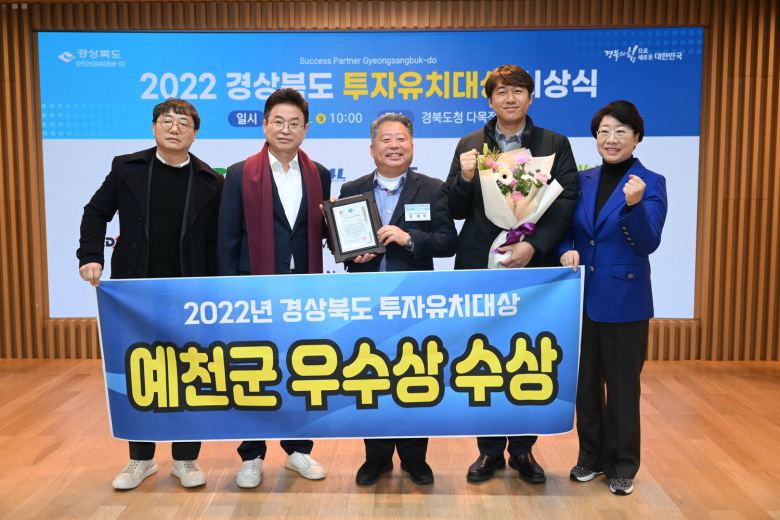 예천군은 ‘2022년 경상북도 투자유치대상’ 평가에서 시·군 자치단체 부문 우수상을 수상했다.이번 종합평가는 도내 23개 시, 군을 대상으로 ▲투자유치실적 ▲기업애로사항 해결 ▲일자리창출 등 투자유치업무 전반에 대해 엄격한 심사와 절차에 따라 선정했다.군은 국내, 외 어려운 경제 여건에도 불구하고 침체되고 있는 지역경제 활성화를 위해 다각도로 기업 유치에 노력을 기울인 결과 5건, 1조1천억원 투자유치 실적을 이뤄냈다.지보면 매창리 일원에 GS건설과 연료전지 발전사업(2560억원) MOU를 체결해 농업혁신타운과 연계했으며 KT와 경북형 클라우드 데이터센터 건립(1천억원) 업무협약으로 첨단지식산업 육성 기틀을 마련한 것은 물론 양자컴퓨터 특성화를 통해 다른 지역과 차별화된 데이터센터 건립을 추진했다.전재익 새마을경제과장은 “이번 수상에 만족하지 않고 지역경제를 살리기 위해 앞으로도 적극적인 기업 유치로 양질의 일자리를 창출 할 수 있도록 최선을 다하겠다”고 말했다.