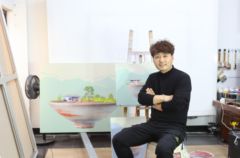 최근 작업들은 ‘집’에 대한 추억을 풀어내고 있다. 모두 공감이 되지는 않겠지만, 동시대의 추억을 나눴던 사람들은 기억속의 정겨움을 되새길 수 있다고 생각한다. 조그만 집이지만 많은 식구와 좁은 공간에서 살을 부비며 살면서 불편했던 삶을 대변하듯 기와집이나 슬레이트집을 막사발 안에 담아내었다.그는 오늘도 따뜻했던 옛 추억을 화면 속에 채워 나가고 있다. 작가의 붓질 하나하나에 쌓인 정(情)이 색채(色彩)가 되고 형상(形相)이 돼 그림을 접하는 다른 이들에게 훈훈함과 따스한 기억을 소환시켜 행복함이 스며들게 했으면 좋겠다는 소망을 가지고 있다.