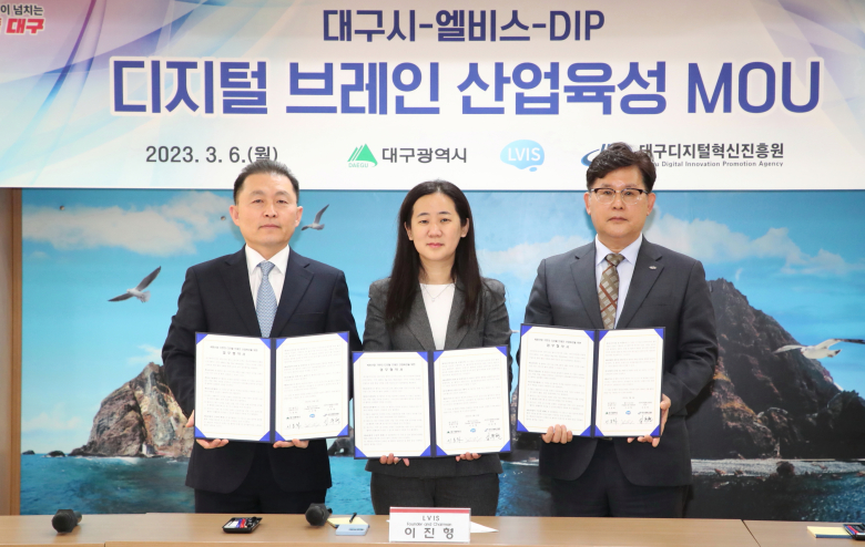 대구시는 6일 산격청사에서 이종화 경제부시장과 엘비스(LVIS) 이진형 대표, 김유현 대구디지털혁신진흥원(이하 DIP) 원장이 참석한 가운데 디지털 브레인 산업 육성 업무협약을 체결했다.엘비스는 미국 실리콘밸리에 위치한 디지털 기반 뇌 질환 진단 및 치료기업으로, 한인 여성 최초로 미국 스탠포드대 신경과학 및 생명공학 종신 교수로 임용된 이진형 대표가 2013년 창업했다.다수의 뇌 관련 국제 특허, 의료 데이터, 신기술을 독점적으로 보유하고 있으며, 뇌 회로를 분석해 치매, 뇌전증 등 각종 뇌 질환을 진단하고 최적의 치료법을 제안하는 인공지능 기반 딥러닝 소프트웨어 뉴로매치를 개발하는 등 인공지능 기반 디지털 헬스케어 분야에서 두각을 나타내고 있다.올해 초 개최된 국제전자제품박람회(이하 CES) 2023에서의 첫 만남을 계기로 시작된 이번 협약은 세 기관의 ABB 기반의 디지털 브레인 산업 기반 구축 및 협력 강화를 목표로 한다. 구체적으로는 DIP는 기관이 보유한 시설과 디지털 장비 활용 및 과제기획을 지원하고, 엘비스는 회사가 가지고 있는 연구개발 성과물을 활용한 과제기획 및 대구지사 설립, 대구시는 이를 위한 행정적 지원을 맡기로 했다. 참고로 엘비스의 대구지사는 3월 중으로 설립 절차를 마무리하고 본격적인 협업사업을 진행할 예정이다.이종화 시 경제부시장은 “CES 2023에서의 만남으로 시작된 이번 디지털 브레인 산업 육성 협약이 대구 미래 50년 번영의 한 축이 될 수 있도록 적극적으로 상호 협력하겠다”고 말했다.