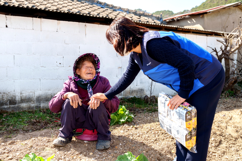 다시 양남면 나산리를 찾은 김경미씨는 수혜자 B씨가 집앞 텃밭을 가꾸는 모습을 발견했다. B씨는 매일 노인정에 나가지만 오늘은 마침 텃밭을 손질하느라 집에 있었다며 김씨를 반갑게 맞이했다. 김씨는 “어르신 얼굴을 뵙고 전해드리니 좋으네요”라며 “자주 얼굴 보여주세요. 저희 어머니도 생각나네요”라고 말하면서 살쩍 눈시울을 붉혔다. 텃밭에 나란히 앉아 도란도란 이야기를 나누는 두 사람은 얼핏 고향에 오랜만에 내려온 딸과 그를 맞은 어머니의 모습과 별반 다르지 않았다. B씨는 돌아서는 김씨의 손을 잡고 텃밭에서 자란 시금치를 한 다발 건넸다. 짧은 만남이지만 진정어린 마음이 전해지는 뭉클한 시간이었다.