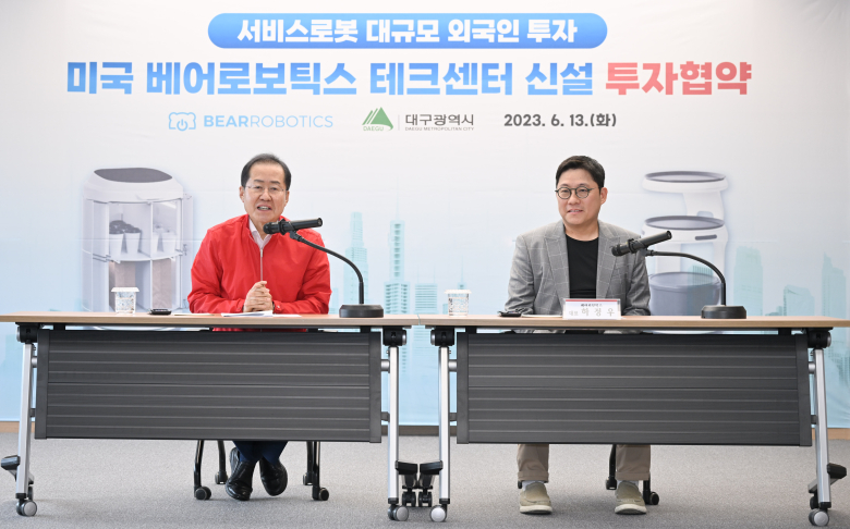 대구시는 13일 오후 시청 산격청사에서 베어로보틱스와 대구테크노폴리스 내 서비스로봇 연구 및 제조시설인 ‘베어로보틱스 테크센터’ 신설을 위한 투자협약을 체결했다고 밝혔다.베어로보틱스는 구글 엔지니어 출신 하정우 대표가 2017년 설립한 세계 최초 AI기반 자율주행 서빙로봇 제조기업이다. 미국 실리콘밸리에서의 연구개발을 시작으로 2020년부터 국내에서 서빙로봇 ‘서비’를 양산했다. 최근에는 소프트뱅크로부터 1000억원 규모의 투자유치에 성공하는 등 차세대 유니콘 기업으로 주목받고 있다. 특히 베어로보틱스는 서비스로봇의 핵심기술인 자율주행기술에 탁월한 기술력을 보유하고 있어 KT, 소프트뱅크, CJ 등 국내·외 대기업 및 유명 프랜차이즈들과의 파트너십 기반 B2B 로봇 판매를 지속적으로 확장하고 있다. 서빙로봇, 방역로봇, 층간이동로봇을 출시해 자체 개발한 플랫폼 기반으로 다양한 분야의 로봇 제품군을 확대해가며 성장하고 있다.베어로보틱스는 연평균 20% 성장률을 보이고 있는 세계 로봇시장에서 글로벌 선도 기업으로 시장을 선점하기 위해 대구테크노폴리스 부지 2만2424㎡(6783평)에 683억원을 투자해 글로벌 거점 역할을 할 연구 및 제조시설인 베어로보틱스 테크센터를 새롭게 건립할 계획이다.이를 통해 베어로보틱스는 로봇단위의 기술개발 이외에도 서비스로봇의 클라우드 기반 관제 기술과 최신 인공지능 기술을 기반으로 인공지능 모빌리티 플랫폼을 구현하는 것을 목표로 하고 있다.베어로보틱스 테크센터가 올해 하반기 착공에 들어가 내년 말부터 가동되면, 대구에서 신제품 개발, 자동화된 품질 테스트, 신품화 및 고도화된 인공지능 플랫폼 기술개발 등을 진행할 예정이다.홍준표 대구시장은 “미국 실리콘밸리의 로봇기업인 베어로보틱스의 대규모 투자가 대구시가 추진하고 있는 로봇산업 육성정책과 시너지효과를 발휘해 대구가 로봇 중심 도시로 도약하는데 큰 역할을 해 줄 것을 기대한다”며 “베어로보틱스가 앞으로 글로벌 시장을 선도하는 로봇 플랫폼 기업으로 성장할 수 있도록 행정적·정책적 지원을 아끼지 않겠다”고 말했다.한편 대구시는 로봇산업을 미래 50년을 이끌 5대 신산업으로 선정, 지역의 풍부한 로봇 인프라와 로봇산업 육성정책을 통해 최근 급성장하고 있는 서비스로봇산업 육성을 본격 추진하고 있다. 서비스로봇 완제품 개발·제작, 도심 전역 서비스로봇 실증·보급, 로봇 벤처·스타트업 육성 등으로 서비스로봇 전주기 지원을 추진하고 있다.올 8월 국가로봇테스트필드 예비타당성 조사가 완료되면 국가로봇테스트필드를 중심으로 체계적인 지원을 통해 서비스로봇 분야 대표기업인 베어로보틱스와 시너지 효과가 기대된다.또 이미 우수한 제조업 역량과 철도 및 고속도로 등 발달된 물류 인프라를 보유한 대구-경북 지역에 2028년 TK신공항이 개항되면 국내 전역은 물론 해외로까지 연결된 세계적인 로봇제조산업 기지로 발돋움할 것으로 기대하고 있다.