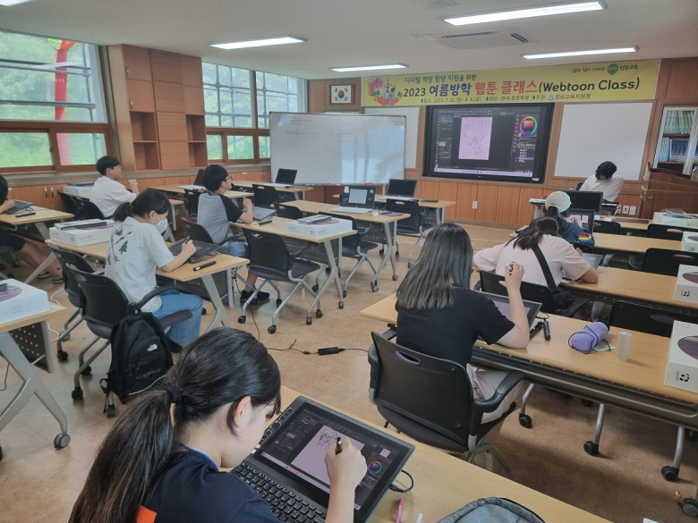 청송교육지원청은 지난달 31일 3층 대회의실에서 관내 초·중학생을 대상으로 디지털 역량 강화 지원을 위한 ‘2023 여름방학 웹툰&메타버스 클래스’를 개강했다. 이번 프로그램은 디지털 역량을 갖춘 미래형 인재 육성을 위해 지난달 31일부터 이달 4일까지 메타버스 크리에이터 전문 강사 및 현직 웹툰 작가를 초청하여 웹툰 제작 기초, 메타버스 아이템 디자인, 3D 모델링, VR/AR 전시관 만들기 등 이론과 실습을 병행하여 학생 맞춤형으로 진행된다.프로그램에 참여한 진보초 학생은 “평소 웹툰에 관심이 많았는데 웹툰 작가들이 실제 작업에 사용하는 장비로 드로잉 실습을 하니 진짜 웹툰 작가가 된 것 같아 기분이 좋고 수업이 재미있다”며“교육에 열심히 참여해서 나만의 멋진 캐릭터와 웹툰을 완성하겠다”고 했다.이호경 교육장은 “디지털 전환으로 인한 직업변화가 가속화됨에 따라 온라인기반 신산업 직업군을 희망하는 학생들이 늘고 있다”며“오늘 교육을 통해 떠오르는 미래 직업을 체험해 보고 여러분의 진로에 대해 탐색해 보는 알찬 시간이 되기를 바란다”고 말했다.