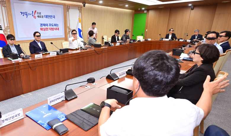 경북도가 29일 도지사, 실국장 등 34명이 참석한 가운데 전국 최초로 MR(혼합현실) 기반 메타버스 시스템을 도입해 간부회의를 시범 운영했다.MR 기반 메타버스 회의시스템은 가상공간을 지양하고 현실과의 연계성을 더욱 강화한 고실감형 텔레프레즌스 기능을 통한 회의문화 혁신을 목적으로 도입됐다.회의 참석자는 경량 AR(증강현실) 글라스를 착용하고 모바일 앱에 접속 후 확장 가상세계 속 회의실 좌석에 자신의 아바타로 참석하면 된다.AR글라스에서 회의자료(PDF)를 공유하면서 발표와 청취를 할 수 있으며 동영상 기능 활용 등 서류 없는 회의가 가능하다.또 모바일 앱 기반 접속으로 해외 출장 등 어디서든 회의 참석이 가능하다.경북도는 가상공간에서도 협업할 수 있으며 ‘함께 있다’라는 실감도가 높아 향후 기존 영상회의보다 사용률이 증가할 것으로 예상하며, 정부 행정시스템의 디지털 전환 선도 모델이 될 것으로 기대한다.이철우 경북도지사는 “메타버스 회의시스템을 통해 시간과 장소에 관계없이 회의 참석이 가능해져 이에 따른 행정비용을 대폭 절감할 수 있다”며 “지역의 사회·경제 전 영역에 확장 가상세계 기술을 활용해 디지털 대전환을 선도하겠다”고 밝혔다.