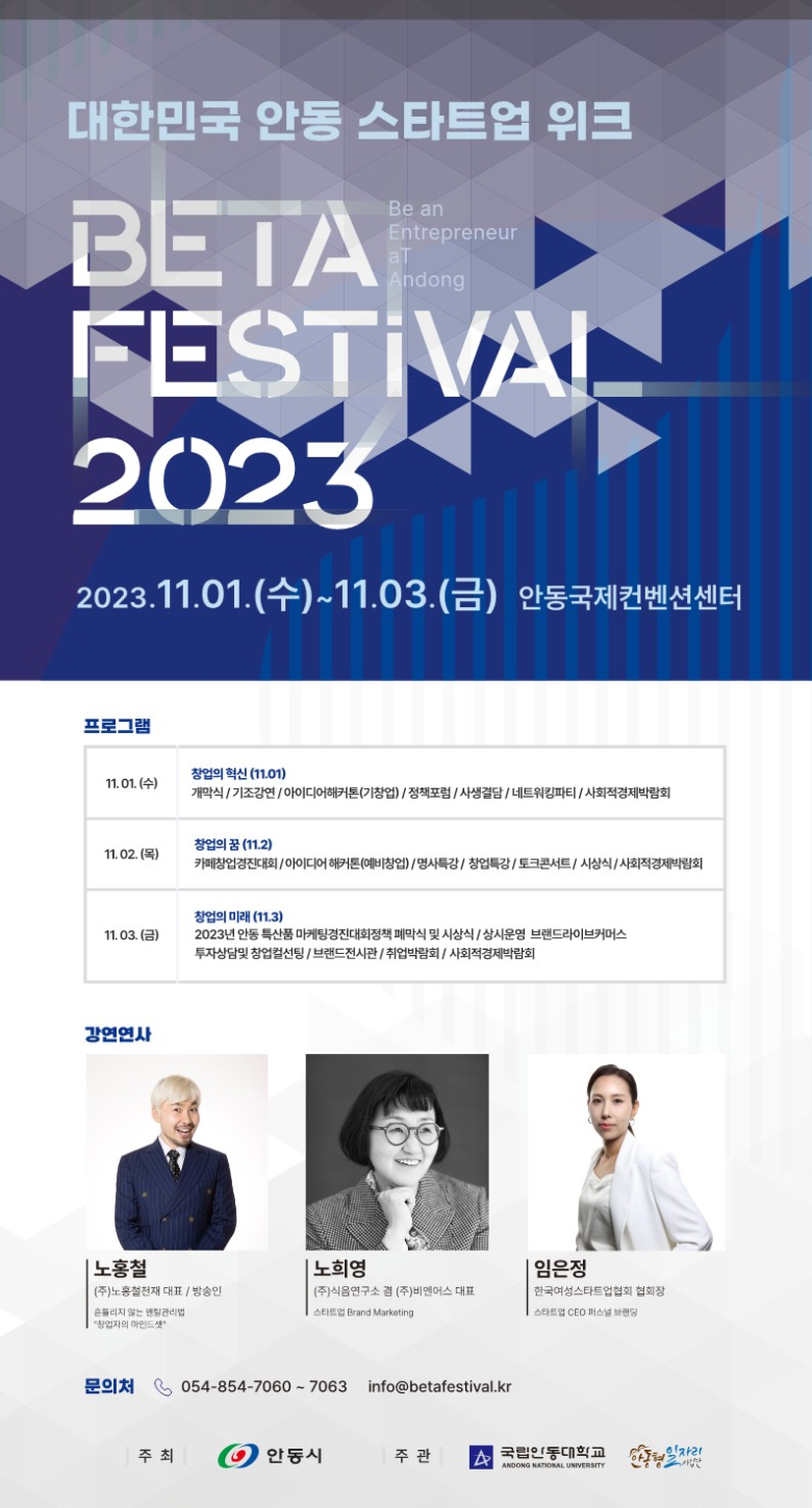 ‘안동에서 기업가가 되자!’라는 의미의 경북 최초 스타트업 중심 창업축제 BETA 페스티벌(Be an Entrepreneur aT Andong)이 1일 오후 2시 화려한 개막을 알렸다.안동시가 주최하고 국립안동대학교 안동형 일자리사업단이 주관하는 본 행사는 예비창업자와 스타트업 기업에 성장 기회를 제공하고 창업문화 저변 확산과 취업 정보 제공을 위해 이달 1일부터 3일까지 사흘간 안동국제컨벤션센터(ADCO)에서 개최된다.이날 개막식은 기존 틀을 탈피해 내빈소개와 인사말을 생략하는 등 의식행사를 대폭 축소한다. 개막 퍼포먼스 또한 역대 BETA 페스티벌 수상자가 참여해 창업자와 대학생 등 참가자 중심으로 진행됐다.기조강연에는 방송인이자 창업가인 ㈜노홍철천재 노홍철 대표가 ‘창업자의 마인드셋’을 주제로 창업자와 대학생들과 열정적으로 소통했다. 본격적인 전국단위 창업 경진대회(기 창업 부문)와 창업을 주제로 MBC ‘사생결담’ 녹화가 진행되어 다양한 콘텐츠를 제공했다.3일간 진행되는 본 행사는 투자상담과 창업컨설팅, 제품 홍보를 위한 스타트업 전시관, 라이브 커머스 방송, 안동시 사회적기업 박람회 및 창업 유관기관 부스가 상시 운영된다. 또한, 분야별 창업경진대회와 창업특강, 토크콘서트 등 창업 인사이트를 위한 다채로운 프로그램을 선보인다.둘째 날인 2일에는 ▲비비고, 올리브영을 비롯해 200여 개의 브랜드를 제작한 식음연구소 노희영 대표의 창업특강 ▲스타트업 대표 3인의 토크콘서트 ▲투자유치를 위한 IR 피칭 ▲안동댐 전망카페의 주인을 찾는 ‘카페창업 경진대회’▲‘예비창업 경진대회’가 진행된다.마지막 날인 3일에는 ▲대학생 부문 안동 특산품 마케팅 경진대회와 ▲SK바이오사이언스, SK플라즈마, 다이텍 등 21개 기업이 참여하는 취업박람회가 개최된다. ▲특히, 오후 1시부터 경북 대학 특성화 학과 혁신지원사업과 연계한 SK바이오사이언스와 SK플라즈마의 취업 특강 및채용설명회가 열려 바이오·백신 관련학과 학생들의 취업을 지원하고 ▲한국여성스타트업협회장 임은정 대표의 강연과 ▲창업 경진대회의 시상식을 마지막으로 행사가 마무리될 예정이다.한편, 대한민국 안동 스타트업 위크 - BETA 페스티벌에 대한 더 자세한 내용은 공식 누리집(betafestival.kr)을 통해 확인할 수 있으며, 프로그램 참여는 창업에 관심 있는 사람 누구나 사전 신청 없이 현장 참여가 가능하다.