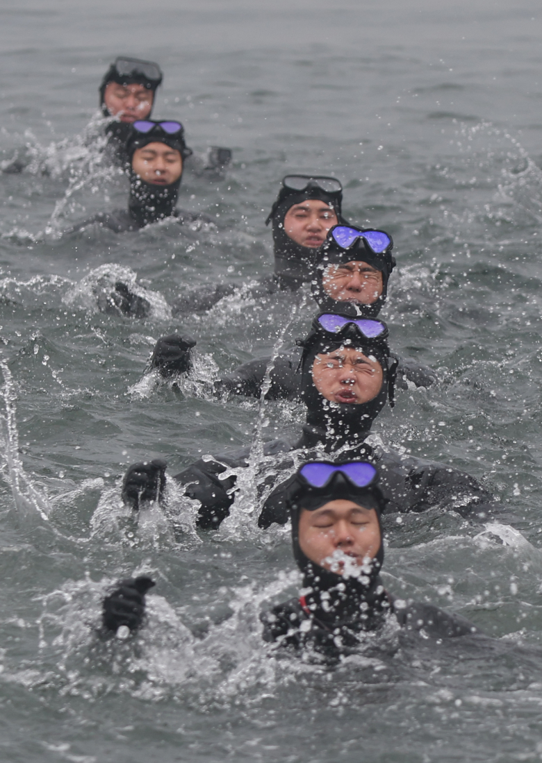 해군 심해잠수사(SSU)가 '큰 추위'라는 뜻의 절기 대한을 이틀 앞둔 18일 경남 창원시 진해구 진해 군항에서 혹한기 훈련 전투 수영에 앞서 힘차게 군가를 부르고 있다. 연합