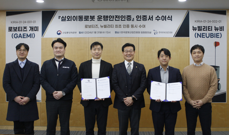 한국로봇산업진흥원(이하 진흥원)이 개정 지능형로봇법 시행에 따라 로보티즈의 ‘개미’와 뉴빌리티의 ‘뉴비’에 최초 실외이동로봇 운행안전인증서를 수여했다고 31일 밝혔다.진흥원은 지난해 11월 산업통상자원부로부터 실외이동로봇 운행안전인증기관으로 지정된 후 '실외이동로봇 운행안전인증 절차 및 기준 등에 관한 고시'에 따라 실외이동로봇 운행안전인증 업무를 개시했다. 운행안전인증 가이드북 배포, 기업 설명회 개최 등 인증제도 홍보 및 안착을 위해 힘써왔다.운행안전인증은 ▲신청접수 ▲서류심사 ▲제품심사 ▲인증서 발급 ▲사후관리 순으로 진행된다. 심사 과정에서는 로봇 운행 안전성을 확인하기 위해 속도 제어, 운행구역 준수, 횡단보도 통행 등 안전기준에 명시된 16개 항목에 대한 평가를 수행한다.손웅희 진흥원 원장은 “실외이동로봇 운행안전 인증으로 로봇의 보도 통행이 허용돼 기대하는 바가 크다”며 “이번 인증을 획득한 2개사 제품을 시작으로 배달뿐 아니라 다양한 서비스의 로봇이 일상에 친숙히 다가갈 수 있도록 적극 지원하겠다”고 밝혔다.진흥원은 그간 국내 배달 로봇 등 실외이동로봇에 대한 규제를 해소하고자 관련 정책을 개발하고 기술지원 업무를 수행해왔다. 지난 2020년부터 ‘로봇 안전성 평가’업무를 신설해 실외이동로봇 기업의 규제샌드박스 실증 착수를 지원해왔다. 또 실외이동로봇 안전기준에 관한 KS 국가표준을 개발하고 민관협의체(자율주행로봇 얼라이언스)에 참여해 국내 유관기업들과 함께 인증제도 및 안전기준 마련을 주도해왔다.한편 같은 날 한국로봇산업협회는 실외이동로봇 손해배상책임 단체보험상품을 출시했다. 이로 인해 진흥원의 실외이동로봇 운행안전인증과 더불어 실외이동로봇의 사업화를 위한 규제 개선과 제도 준비가 완료됐다.