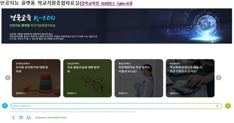 경북교육청이 2월 중으로 도 교육청 누리집 내 인공지능 플랫폼인 학교지원종합자료실을 개편하기로 했다.지난해 11월 전국 공공기관 최초 생성형 AI 도입으로 문을 연 학교지원종합자료실은 방대한 양의 데이터를 스스로 인지․학습하고 생성해 교직원의 행정업무 질문에 답변하는 방식으로 교육행정 업무자료를 제공한다.누적 이용자 수 200만명을 넘어선 학교지원종합자료실은 2월 발전적 개편을 통해 경북 체험학습에 관한 정보를 제공하는 통합플랫폼으로 진화하게 된다.또 누구나 로그인 없이 이용할 수 있고, 사용자의 선택에 따라 지역과 주제별 코스를 제공하는 등 학생들의 다양한 체험학습 지원과 교직원 행정업무 경감에 큰 도움이 될 것으로 기대된다.또한, 답변 속도 개선과 메인 페이지 디자인 개편으로 더욱 향상된 기능과 사용자 경험을 제공하게 된다.임종식 경북교육감은 “우리 아이들이 자신의 꿈을 마음껏 펼쳐 글로벌 인재로 성장할 수 있는 디지털 교육환경을 구축하겠다”며, “새롭게 업그레이드된 인공지능 플랫폼 학교지원종합자료실을 더욱 많은 분이 활용하시길 바란다”고 말했다.