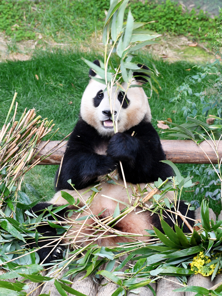 푸바오가 일반 관람객들을 만나는 마지막 날인 3일 경기 용인시 에버랜드 판다월드에서 강철원 사육사에게 유채꽃 선물을 받고 있다. 푸바오는 오는 4일부터 판다월드 내실에서 야생동물 이동에 대한 국제 규정에 따라 건강, 검역 관리를 받고 이송 케이지 사전 적응 훈련도 진행한다. 연합