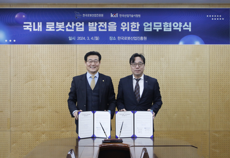 한국로봇산업진흥원이 4일 진흥원 본원에서 한국산업기술시험원과 로봇산업 성장 지원을 위한 업무협약을 체결했다.양 기관은 협약을 통해 ▲로봇분야 시험인증·연구개발 및 교육 ▲국책과제 성과물에 대한 시험 ▲정책개발 및 기술사업화 협력 ▲로봇산업 활성화 및 관련 분야 기업 성장지원 ▲로봇분야 인프라 해외기술규제, 해외인증 정보 및 기술교류를 협력한다.손웅희 한국로봇산업진흥원장은 “국가 전략기술인 로봇산업의 기술지원 요구가 다양해지고 있다"며 "양 기관 협력을 통해 시험인증 등 기술지원의 품질을 높이고 기술지원 범위 또한 확대해 나가도록 하겠다”고 말했다.