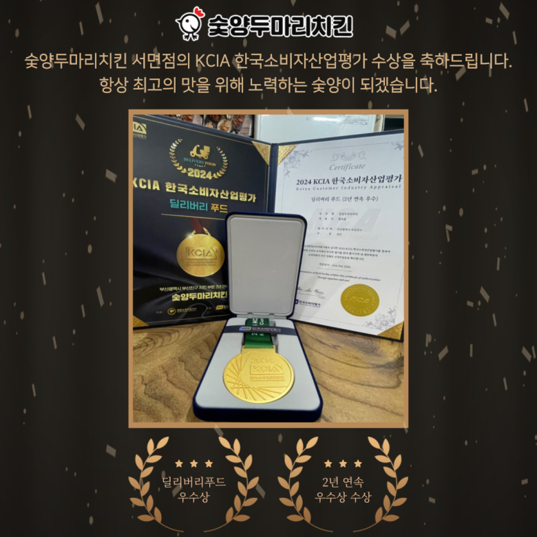 치킨창업∙숯불 치킨 전문 프랜차이즈 숯양두마리치킨(대표 조승현)이 자사의 가맹점 서면점이 '2024 KCIA 한국소비자산업평가’ 우수상을 2년 연속 수상했다고 밝혔다.‘숯양두마리치킨부산서면점’은 KCIA 한국소비자산업평가를 통하여 진행된 전국 단위 소비자 조사에서 우수한 평가를 받았으며, 딜리버리푸드 부문에서 2년 연속 우수상을 수상하며 남다른 브랜드 경쟁력을 입증받았다는 것이 업체 측 설명이다.한편, 숯양두마리치킨은 '숯불의 정석, 치킨의 정석’이라는 슬로건을 바탕으로 다양한 치킨 메뉴를 선보이고 있으며, 장기간 연구 끝에 특제 비법 소스를 자체 개발하여 숯불 치킨의 특별한 맛을 만들어냈다. 숯불매운소금구이, 숯불양념구이 등의 숯불 치킨 메뉴와 대중적인 후라이드치킨, 눈꽃치즈치킨 등 맛있고 담백하게 튀긴 치킨 메뉴를 제공하고 있다.숯양두마리치킨 관계자는 “숯양두마리치킨은 부산에서 시작해 경기도, 경남, 울산, 광주, 전주, 순천 등 전국 40호점 달성을 앞두고 있다”라며 “현재 창업 프로모션을 통해 가맹보증금 면제, 로열티 면제, 인테리어 본사 마진 제로, 오븐기와 튀김기 원가 제공 등 다양한 창업 혜택을 제공하며 전국 가맹 사업을 추진하고 있다”라고 말했다.이어 “우리 브랜드는 소자본으로 치킨창업을 할 수 있도록 숯양두마리치킨만의 노하우를 바탕으로 가맹사업을 운영하고 있다. 가맹점과의 지속적인 상생을 위해 최소한의 비용으로 성공할 수 있는 매장 개설에 힘을 쓰고, 가맹점 운영의 노하우 및 지속적인 운영, 문제점 분석 등 각 가맹점 별 매출이 상승하도록 가맹본부에서 온 힘을 쏟고 있다”고 덧붙였다.