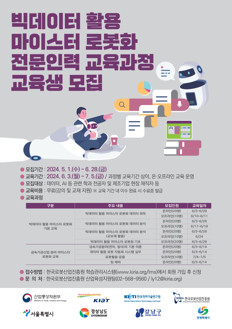 한국로봇산업진흥원(이하 진흥원)이 ‘빅데이터 활용 마이스터 로봇화 전문인력 교육과정을‘을 개설해 오는 6월 25일까지 교육생을 모집한다.진흥원은 ‘빅데이터 활용 마이스터 로봇화 기반구축사업’을 통해 2022년부터 산업용 로봇에 뿌리기술 제조 분야 숙련공의 현장 노하우를 디지털화해 현장 산업체와 종사자들이 활용할 수 있도록 교육과정을 운영해 총 426명의 인력을 양성했다.올해 교육과정은 교육생 만족도와 교육 수요가 높았던 기존 교육과정 외에 현장 산업체 종사자들의 제조 기술 로봇 데이터화에 대응하기 위한 실습 과정을 추가적으로 개설해 운영한다. 실습 과정 교육은 제조 현장 데이터의 로봇화 접목에 필요한 데이터 기본과정 외에 협동 로봇 활용 기술 능력을 강화할 수 있는 내용을 중심으로 강의가 구성됐다.전체 교육 프로그램은 ▲기초 데이터 개론 교육과 교보재를 활용한 데이터 분석 실습 교육 ▲금속가공 분야 주요 기술인 연마, 절삭에 관한 이론 교육 ▲데이터를 활용한 로봇 자동화 시스템 실무와 로봇 활용 기술 중 하나인 힘 제어에 대한 이론 교육 ▲협동 로봇 운용을 위한 기초 로봇 실습 교육이 진행될 예정이다.교육은 개설 과정에 따라 온라인, 오프라인으로 나뉘어 무료로 진행되며 교육은 학습관리시스템 홈페이지를 통해 신청 가능하다. 교육 기간은 6월 3일부터 7월 5일까지 각 교육과정 별로 상이하게 운영된다.교육에 대한 자세한 사항은 학습관리시스템 홈페이지나 문의처를 통해 확인할 수 있다.손웅희 한국로봇산업진흥원장은 “산업환경 변화로 제조 분야에서도 로봇화 공정 전환이 가속화됨에 따라 기존 제조 기술 인력들의 기술 로봇화 등 디지털화 수요가 높아지고 있다"며 "이번 교육과정을 통해 직무 활용 역량을 강화시킬 수 있을 것으로 기대한다”고 밝혔다.