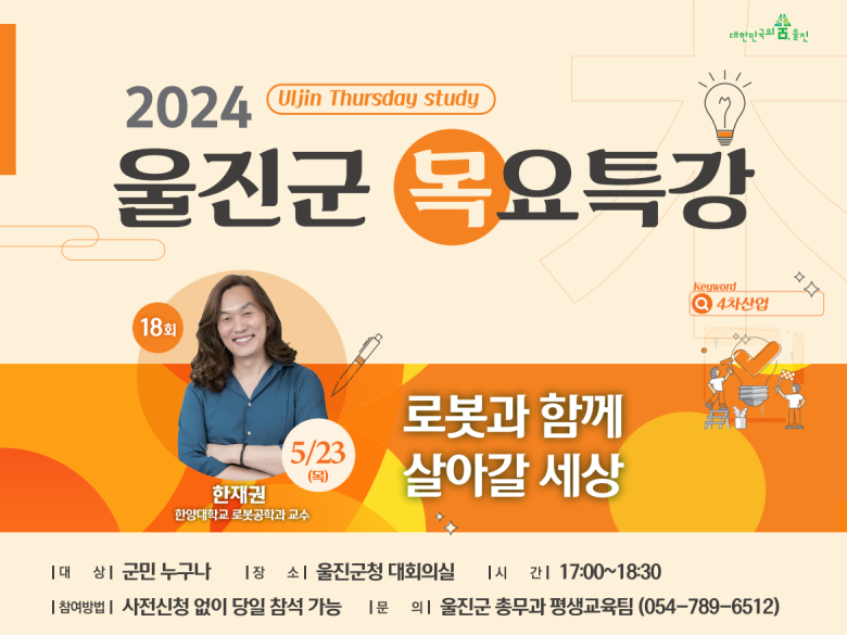 울진군은 오는 23일 군청 대회의실에서 한재권 한양대 로봇공학과 교수를 초청해 ‘로봇과 함께 살아갈 세상’이라는 주제로 제18회 목요특강을 개최한다.