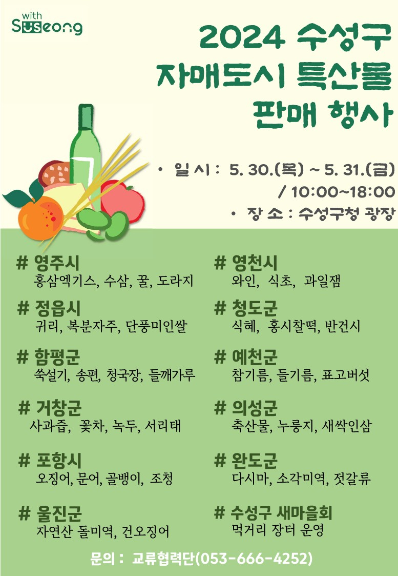 대구 수성구가 오는 30일과 31일 이틀간 구청 광장에서 ‘2024 수성구 자매도시 특산물 판매행사’를 연다.행사는 오전 10시부터 오후 6시까지 진행되며 자매도시 11곳과 수성구새마을회가 참여한다.