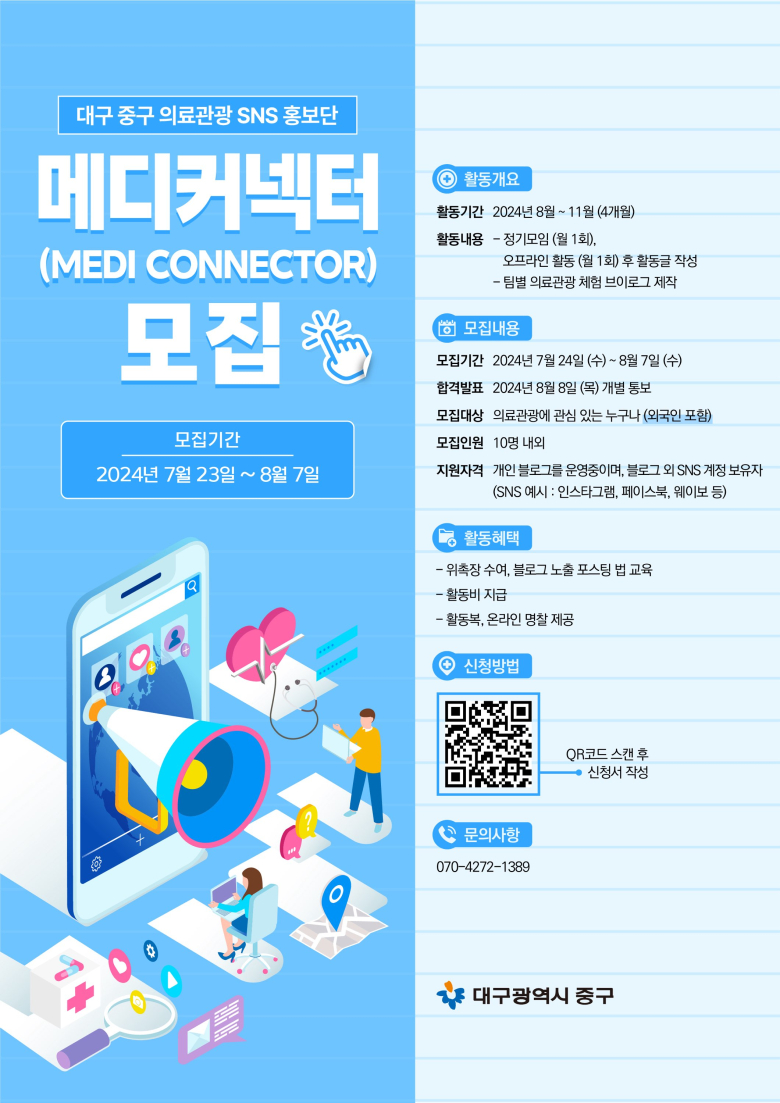 대구 중구가 다음달 7일까지 중구 의료관광 홍보를 위한 대구 중구 의료관광 SNS 홍보단 ‘메디커넥터’를 모집한다. 메디커넥터는 ‘의료와 관광, 그리고 사람을 연결한다’라는 의미를 가지고 있다.
