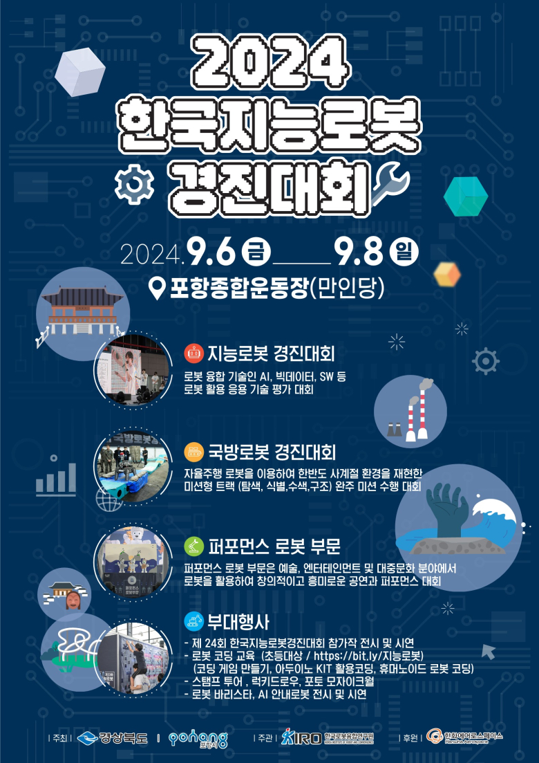경북도와 포항시가 주최하고 한국로봇융합연구원이 주관하는 '제24회 한국지능로봇경진대회'가 6일부터 8일까지 3일간 포항 만인당에서 개최된다.1999년에 첫발을 내디딘 한국지능로봇경진대회는 올해로 24회로 ‘로봇과 인간, 함께 만들어가는 미래!'라는 주제로 총 3개 종목(지능로봇, 퍼포먼스 로봇, 국방 로봇)에 총 23팀, 130명의 참가자가 3일간 열띤 경쟁을 펼친다.지능로봇 부문에는 시각장애인을 위한 보조 로봇, 재난 탐사 드론 등 다양한 혁신적 아이디어가 돋보였고 퍼포먼스 로봇은 로봇과 무대 예술이 결합한 창의적인 퍼포먼스를, 국방 로봇은 국내 사계절 환경을 재현한 미션형 트랙을 통해 로봇의 작전 수행 능력을 겨루게 된다.또 대회 기간 관람객들을 위해 생성형 AI를 활용한 코딩 교육과 자율주행 로봇 만들기 등 다양한 부대행사와 프로그램을 준비했고, 연계 행사인 ‘포항가족과학축제’에는 메타버스 라이딩, 자율주행 기술 체험, 로봇 제작 등 다채로운 과학 체험 행사가 마련된다.이정우 경북도 메타AI과학국장은 “대회가 청소년들이 과학기술에 대한 흥미를 키우고 자신의 역량을 발휘하는 기회가 되길 바란다”며, “앞으로도 로봇산업의 발전과 미래 인재 양성을 위해 적극 지원하겠다”고 밝혔다.
