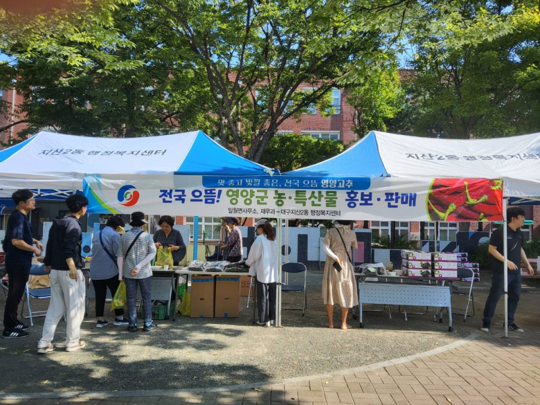 영양군 일월면은 영양군청 재무과 직원, 일월면 농가와 함께 10 ~ 11일 양일 간 대구시 수성구 지산2동 에덴어린이공원에서 영양군 농·특산물 홍보 및 직거래 행사를 실시했다.이날 행사는 지산2동 주민자치위원회, 새마을부녀자회 회원 등의 적극적인 지원으로 건고추, 고춧가루, 건나물, 포도, 버섯 등을 판매하여 주민들의 큰 관심과 호응을 얻었다. 이번 행사는 우수한 영양 농·특산물 판매를 촉진하고 농특산물 직거래를 통해 홍보 및 농가소득 증대에 기여했다.전국으뜸 영양군 농·특산물을 직접 소비자들에게 찾아가 판매함으로써 농가들에게는 판로개척과 소득증대를, 행사장을 찾은 수성구 지산2동 주민들에게는 우수한 농·특산물을 저렴하게 구입할 수 있는 기회를 마련했다.박형일 일월면장은 “최근 8월 지속적인 폭염으로 농작물 생산량 감소와 일손 부족으로 이중고를 겪는 농가에 이번 직거래행사로 작은 위로의 계기가 되길 바라며 앞으로 지속적인 직거래행사를 통해 안정적이고 다양한 판매망을 구축하여 농가의 소득증대를 위해 최선을 다하겠다”라고 말했다.