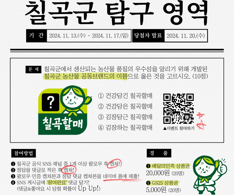 퀴즈&팔로우 이벤트는 오는 13~17일까지 진행돼, 당첨자 발표는 20일 칠곡군 SNS를 통해 확인할 수 있다.김재욱 칠곡군수는 “이번 SNS 이벤트는 우리 군의 농산물 공동브랜드인 ‘건강담은 칠곡할매’의 인지도를 높이고 지역 농산물의 우수성을 널리 알릴 수 있는 중요한 기회”라며 “앞으로도 공식 SNS 채널을 통해다양한 계층의 주민들과 소통하는 데 힘쓸 것”이라고 말했다.