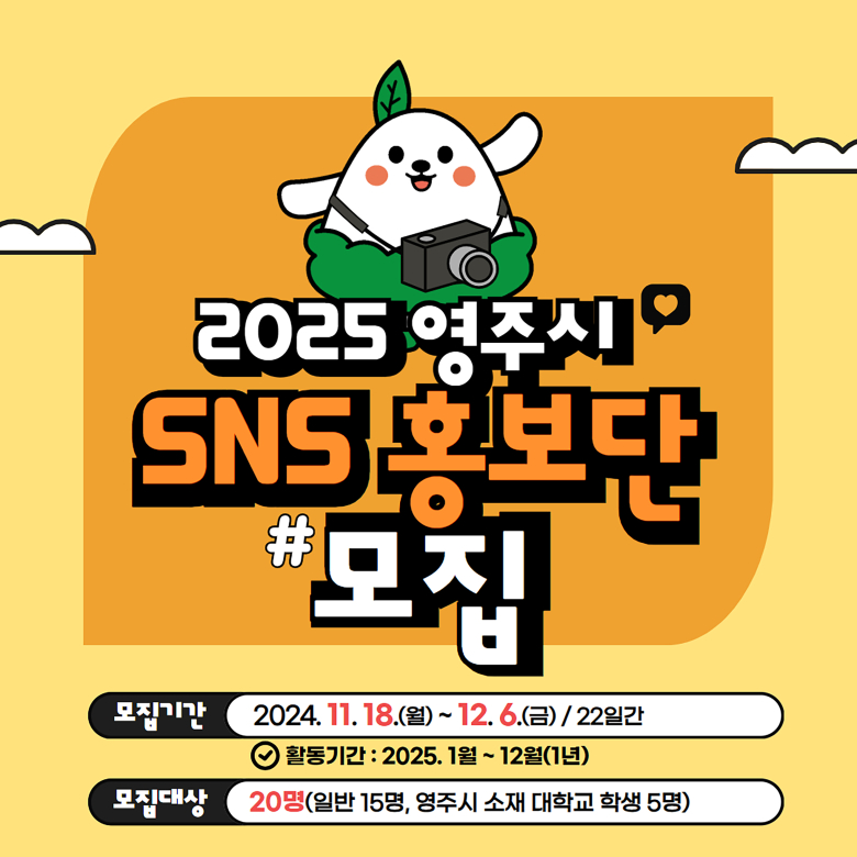 영주시는 오는 18일부터 내달 6일까지 ‘2025년 영주시 SNS 홍보단’을 모집한다.SNS 홍보단은 영주의 매력과 시정 소식, 관광 정보 등을 SNS를 통해 생생하게 전달하는 지역 홍보의 역할을 맡는다.모집인원은 총 20명으로 ▲18세 이상 지역 제한이 없는 일반인 15명 ▲영주시 소재 대학생 5명이다. 영주에 관심을 갖고 매월 1건 이상의 콘텐츠를 제작할 수 있는 사람이라면 누구나 지원할 수 있다.홍보단은 내년 1월부터 12월까지 활동하며 영주시의 축제, 시정 소식, 관광, 명소, 맛집, 문화, 생활정보를 취재해 SNS 콘텐츠로 소개하게 된다. 또한 시 공식 SNS 계정의 모니터링과 댓글, 좋아요, 공유 등으로 콘텐츠의 파급력을 높이는 역할도 수행한다.신청은 영주시청 홈페이지(http://www.yeongju.go.kr) 고시/공고에서 지원신청서를 내려받아 작성 후 전자우편(kimooa@korea.kr)으로 제출하면 된다. 일반인과 대학생 신청서를 구분해 작성해야 하며, 서류 미비 시 접수에서 제외된다.홍보단은 소셜미디어 활용 능력, 관련 경력, 포스팅 수준 등을 종합 평가해 선발하며 최종 결과는 다음달 중 시 공식 SNS에 게시하고 개별 통보한다.선발된 홍보단은 기사 채택 시 원고료 지급, 영주 관광지 팸투어 참여, 소셜미디어 우수활동자 표창, 홍보단 행사 참여 시 행사 실비 지원 등의 혜택을 받는다.김종길 홍보전산실장은 “SNS의 영향력이 커진 만큼 SNS홍보단은 시정 홍보의 중요한 역할을 담당하고 있다. ‘머물고 싶은 여행지, 매력 있는 관광지 영주’를 알려 나갈 수 있도록 능력 있는 분들의 많은 참여를 바란다”고 말했다.