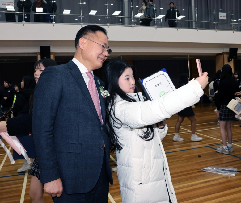 매년 2월이면 졸업식 시즌 때라 지난 7일 순심여자중·고등학교 졸업식. 순심여중 3학년 윤가은 양이 순심교육재단이사장 표창장을 받자마자 연단에서 내려오지 않고 외쳤다.“사진 한 장 찍고 내려가겠습니다!”윤 양은 무대를 바라보며 졸업생이 앉아 있는 방향으로 몸을 돌렸고, 함께 표창장을 받은 한 순심여고 졸업생과 휴대전화를 꺼내 들었다. 두 사람이 나란히 서서 셀카를 찍자, 행사장은 환호성과 박수로 가득 찼다.과거 졸업식에서는 친구들과 작별을 아쉬워하며 눈물을 흘리는 모습이 익숙했지만 이제는 분위기가 달라졌다. 학생들은 서로를 응원하며 웃음을 나누고, SNS로 추억을 남기며 순간을 기록했다. 선생님들과 학부모들도 흐뭇한 미소를 지으며 이를 지켜봤다.이 모습을 본 김재욱 칠곡군수는 학생들의 밝은 태도를 흐뭇하게 지켜봤다. 김 군수는 “학생들의 밝고 당당한 태도가 인상적”이라며 변화하는 졸업식 문화에 긍정적인 반응을 보였다.몇몇 졸업생은 김 군수에게 다가가 “군수님, 사진 한 장 찍어주세요“라고 요청했다. 김 군수도 환한 미소로 응답해 학생들과 함께 사진을 찍었다.학생들은 졸업식장에서 찍은 사진을 인스타그램과 틱톡 등에 올리며 #졸업셀카, #졸업축제 등의 해시태그를 활용해 친구들과 추억을 공유했다. 일부 학생들은 졸업 영상을 유튜브 숏츠와 릴스에 업로드하며 축제 분위기를 더욱 확산시켰다.졸업식 후 윤가은 양은 “졸업식을 더 즐겁게 만들어 보고 싶었다”고 말했다. 이어 “졸업은 끝이 아니라 새로운 출발이니까, 친구들과 좋은 추억을 남기고 싶었다”며 “친구들과 함께 웃으며 졸업할 수 있어 행복하다”고 밝혔다.김 군수는 “젊은 세대가 자유롭게 꿈을 펼칠 수 있도록 적극 지원할 계획”이라며 “졸업생들이 자신만의 길을 당당하게 걸어가길 기대한다”고 덧붙였다.