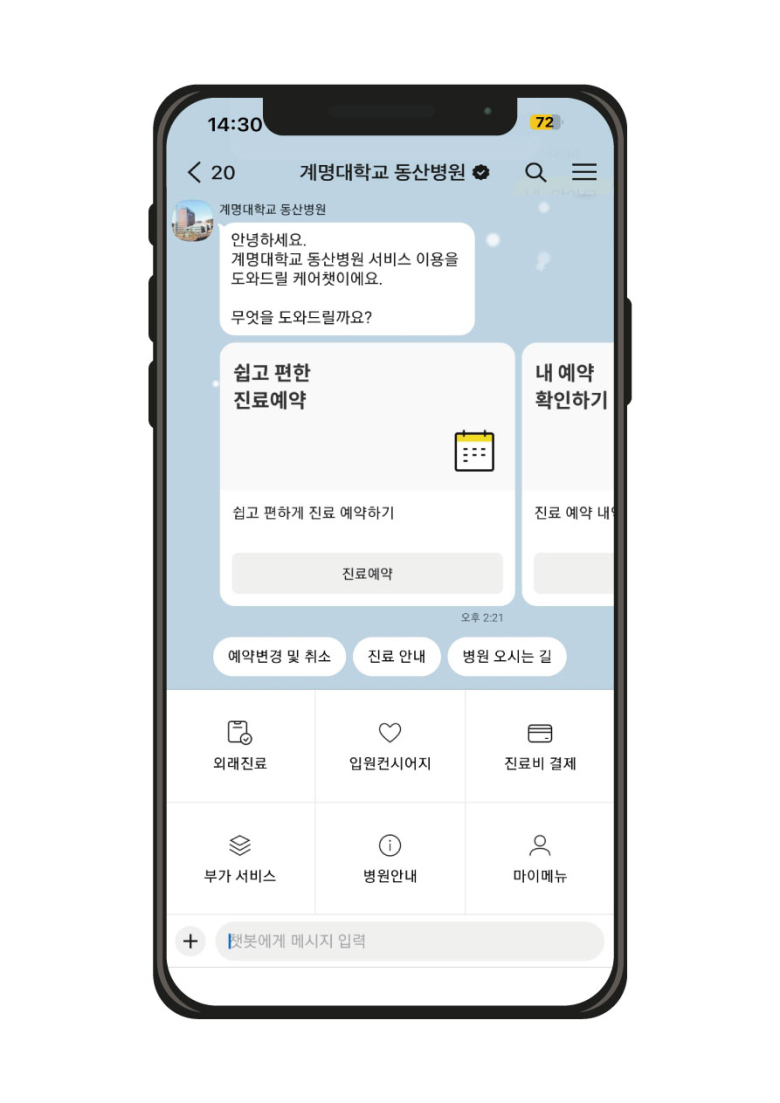 기존 타 대학병원에서는 진료 예약에 한정된 케어챗을 도입한데 반해 계명대 동산병원은 국내 최초로 입원 수속부터 퇴원까지의 모든 과정을 지원하는 ‘입원 컨시어지 서비스’까지 제공한다.
