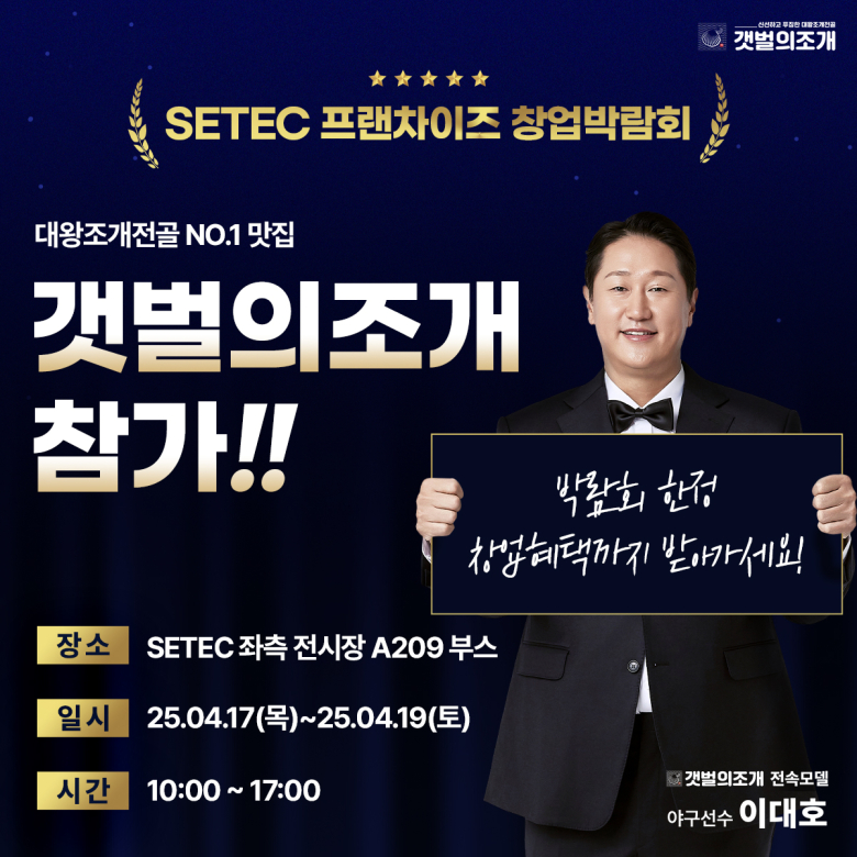 술집창업 브랜드 갯벌의조개가 오는 4얼 17일(목)부터 19일(금)까지 서울 학여울역 인근 SETEC(세텍) 좌측전시장에서 개최되는 프랜차이즈 창업박람회에 참가하여 예비창업자들과 직접 소통하는 자리를 마련한다고 밝혔다.갯벌의조개는 도심에서도 푸짐하고 신선한 대왕조개전골 메뉴를 제공하며 독점성 강한 창업아이템으로 쉬운 운영 시스템과 높은 테이블 단가로 신규창업, 업종변경 관계없이 모든 예비창업자들에게 높은 관심을 받고 있다.특히 최근에는 대한민국에서 가장 유명한 스포츠스타 중 하나인 야구 레전드 이대호 선수를 전속모델로 발탁하여 1,000만 야구 팬들에게 주목받는 브랜드로 자리매김하고 있다.이번 세텍 창업박람회에서 갯벌의조개는 좌측전시장 A209 부스에서 본사만의 특별한 운영 노하우부터 창업 비용, 지원 시스템 등 다양한 정보를 제공할 예정이며, 현장 방문 상담자들에게는 실제 창업 매장 운영 사례와 실질적으로 창업에 도움이 되는 혜택까지 제공된다.갯벌의조개 관계자는 “이번 박람회를 통해 더욱 많은 예비창업자들과 현장에서 직접 소통하며 갯벌의조개 창업의 실질적인 장점과 경쟁력을 전달할 수 있는 좋은 기회가 될 것”이라며, “오직 현장 상담자에게만 제공되는 특별 혜택도 준비되어 있으니 많은 관심과 방문 부탁드린다”고 전했다.제77회 프랜차이즈 창업박람회 SETEC 2025는 오전 10시부터 오후 5시까지 진행되며 갯벌의조개 부스는 좌측전시장 A209에 위치해 있다.