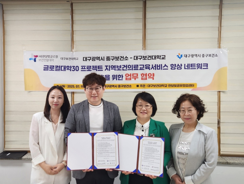 글로컬대학 대구보건대학교 한달빛공유협업센터가 지난 11일 대구 중구보건소와 ‘지역보건의료교육서비스 향상 네트워크 구축을 위한 업무협약’을 맺었다. 이번 협약은 건강취약계층의 보건의료 교육 지원과 지역사회 상생을 목표로 협력을 통한 지속 가능한 보건의료 교육서비스 체계를 구축하고자 마련됐다.