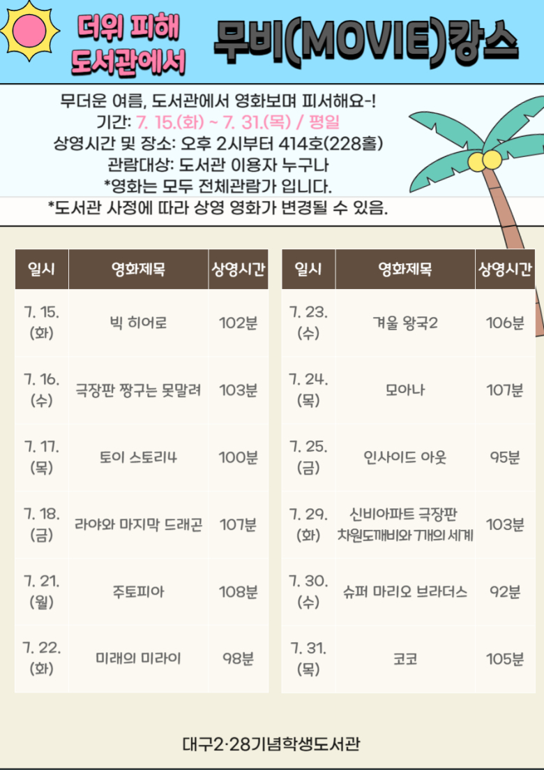 대구시교육청 산하 공공도서관 10곳이 본격적인 폭염에 대비해 지역 주민을 위한 ‘피서형 문화 프로그램’을 운영한다. 도서관을 단순한 지식공간을 넘어 문화·교육 복합공간으로 탈바꿈시키기 위한 이번 행사는 영화 상영, 도서 전시, 체험활동 등을 중심으로 이달 말까지 이어진다.대구교육청은 “폭염에 취약한 시민들이 안전하고 쾌적한 공간에서 여름을 보낼 수 있도록 냉방된 자료실을 상시 개방하고 도서 전시 및 다양한 문화 프로그램을 마련했다”고 14일 밝혔다.운영 시간은 대부분 오전 9시부터 오후 7시까지이며 국채보상·북부·수성도서관은 오후 10시까지 연장 개관한다. 어린이자료실은 오전 9시부터 오후 6시까지 운영된다.각 도서관은 여름철에 어울리는 테마 도서를 선정해 전시하고 시청각실을 활용한 가족영화 상영도 병행한다.2·28기념학생도서관은 15일부터 말일까지 매일 오후 2시부터 ‘228홀’에서 전체관람가 영화를 상영해 가족 단위 방문객의 호응을 유도할 계획이다. 국채보상운동기념도서관은 ‘잉글리쉬 매직쇼’, ‘북캉스 도서 추천 이벤트’ 등 온 가족이 함께할 수 있는 체험 행사를 준비했다.동부도서관은 영어 도서를 주제로 한 ‘Adventure Book of the Month’ 전시와 함께 명언 필사로 나만의 책갈피를 만드는 코너를 운영한다. 남부도서관은 ‘한여름 남부 시네마’라는 이름으로 16일부터 매주 수~금요일에 인기 영화를 상영한다.북부도서관은 ‘온가족 춤추는 도서관’, 인형극 ‘토끼의 재판’ 등 체험형 프로그램을 선보이며 서부도서관은 도서관 로비에 실내 정원을 마련하고 영화 상영을 주 3회로 확대했다.두류도서관은 다큐멘터리 및 영화 상영과 더불어 ‘가로세로 낱말 퀴즈’, ‘세계여행 체험’ 등의 행사를 운영 중이다. 수성도서관은 지하 미디어홀에서 매주 4회 ‘한여름 쿨쿨 시네마’를 통해 가족 관람객을 맞이하고 있다.달성도서관은 매주 일요일 다목적강의실에서 전체관람가 영화 상영을 진행하며 마지막 주 수요일에는 ‘문화가 있는 날’ 특별 상영도 마련했다.삼국유사군위도서관은 29일부터 사흘간 ‘전설의 고향 2025: 귀신도 출근하기 싫은 날’이라는 독특한 타이틀로 여름 공포영화 상영 이벤트를 마련해 세대 간 소통의 장을 마련한다.김칠구 2·28기념학생도서관장은 “폭염 속에서 도서관이 시민의 마음과 건강을 지키는 피서지 역할을 할 수 있도록 준비했다”며 “시원한 공간에서 책과 문화가 함께하는 여름을 보내시길 바란다”고 말했다.한편 대구교육청은 오는 9월 30일까지를 폭염 대책기간으로 정하고, ▲비상대책반 운영 ▲행동요령 교육 강화 ▲교육환경 개선 ▲학사일정 탄력 운영 등 4개 핵심 과제를 중심으로 폭염 종합대책을 추진한다.