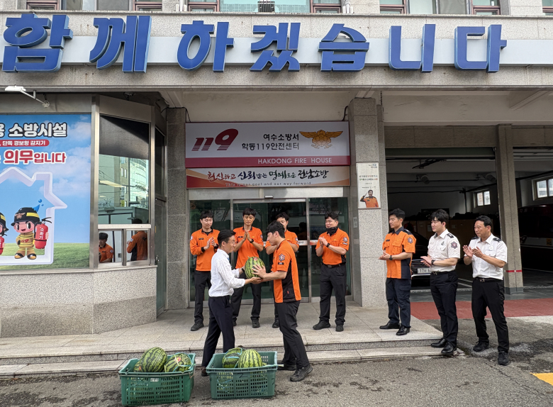 여수시 돌산읍에 위치한 깔라까따 호텔이 지난 8월 5일과 6일, 여름철 폭염 속에서도 시민의 안전을 위해 애쓰는 여수소방서와 돌산파출소를 직접 방문해 제철 수박을 기부하며 감사의 마음을 전했다.