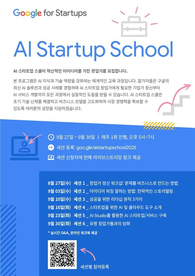 경북도가 27일부터 9월30일까지 국제적 테크기업 구글(Google)과 함께 지역 내 인공지능(AI) 분야 기업인·창업가를 비롯한 창업을 준비하는 지역민을 대상으로 실전 창업 교육 프로그램인 ‘AI 스타트업 스쿨(AI Startup School)’을 운영한다.실시간 온라인 형식의 이번 교육은 매주 1회씩 2시간(오후 5시~7시) 동안 진행되며, 참가자는 구글의 최신 인공지능(AI) 솔루션과 실제 창업 사례를 바탕으로, 기술 역량과 비즈니스 마인드를 동시에 키울 수 있는 체계적인 프로그램을 이수하게 된다.또 실시간 Q&A와 온라인 워크북도 함께 제공해, 참가자들의 학습 효과를 극대화할 수 있도록 지원한다.창업가 정신과 문제 해결 중심의 비즈니스 마인드 함양, 아이디어를 효과적으로 전달하는 IR피칭과 스토리텔링 전략, 리더십 원칙과 조직 강화 등 창업가의 내부 역량 강화를 시작으로, AI 및 클라우드 도구의 실전 활용법, 구글 AI 스튜디오를 활용한 서비스 구축 방법, 성공한 창업가들과의 대화 세션까지, 기초부터 실전 응용까지 아우르는 탄탄한 교육과정이 기다리고 있다.참가 신청은 AI 스타트업에 관심 있는 도민이면 누구나 가능하며, https://goo.gle/aistartupschool2025 또는 포스터 내 QR코드를 통해 참가 등록을 할 수 있다. 도민의 적극적인 참여 독려를 위해, 한동대학교와의 협력으로 한동대학교 에벤에셀관에서 ‘Watch-Party'가 진행된다. 최혁준 경북도 메타에아이(AI)과학국장은 “AI 스타트업 스쿨은 기술과 창업이 결합한 교육 플랫폼으로, 지역의 혁신 창업 생태계를 만들어 가는 계기가 된다”며 “경북도와 구글의 파트너십이 본궤도에 오른 만큼 세계 최고 수준 기업의 역량이 지역 기업의 성장으로 연결될 수 있도록 협력을 확대해 나가겠다”고 밝혔다.한편, 경북도는 지난 5월 구글과 전략적 파트너십을 구축하고 경주에서 개최되는 APEC 2025 KOREA의 성공적 개최를 위해 긴밀하게 협력하기로 했다.