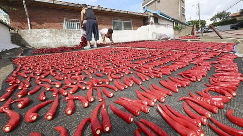 절기상 날씨가 선선해진다는 처서(處暑)를 사흘 앞둔 20일 인천 동구 화수동 주택가에서 주민들이 뜨거운 햇볕 아래에서 고추를 말리고 있다. 연합뉴스