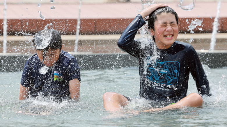 폭염이 이어진 24일 서울 영등포구 여의도물빛광장에서 어린이들이 물놀이하고 있다. 연합뉴스