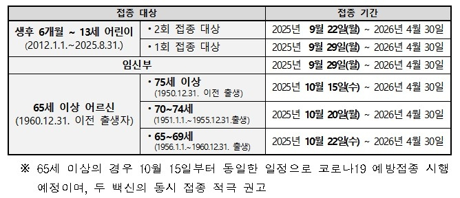 질병관리청은 다음 달 22일부터 내년 4월 30일까지 2025~2026절기 인플루엔자(독감) 국가예방접종을 할 계획이라고 25일 밝혔다.중증화 위험이 큰 6개월∼13세(2012년 1월 1일∼2025년 8월 31일 출생자) 어린이와 임신부, 65세 이상(1960년 12월 31일 이전 출생자) 노인 등은 무료로 접종할 수 있다.이번 인플루엔자 국가예방접종은 세계보건기구(WHO)의 권고와 예방접종전문위원회 심의에 따라 기존 4가 백신에서 3가 백신으로 바꿔 시행한다.3가 백신은 전 세계적으로 장기간 검출되지 않고 있는 B형 야마가타 바이러스의 항원을 4가 백신에서 뺀 것으로, 효과성과 안전성에서 4가 백신과 차이가 없는 것으로 확인됐다는 게 질병청의 설명이다.미국은 2024~2025절기에 4가에서 3가로 백신을 바꿨고, 일본과 대만, 영국도 이번 절기부터 바꿀 예정이다.인플루엔자 국가예방접종은 자신의 주소지와 관계없이 가까운 위탁의료기관, 보건소에서 할 수 있다.전국 위탁의료기관은 약 2만3000곳으로, 관할 보건소나 예방접종도우미 홈페이지(nip.kdca.go.kr)에서 찾아볼 수 있다.접종하러 갈 때는 신분증을 지참하고, 접종 후에는 20∼30분간 머물러 이상 반응을 관찰한 후 귀가해야 한다.가장 흔한 이상 반응으로는 접종 부위의 발적(빨갛게 부어오르는 현상)과 통증 등이 있는데, 대부분 하루 이틀 안에 사라진다.인플루엔자 예방접종은 코로나19 백신 접종과 동시에 할 수 있다. 다만, 동시에 접종하는 경우 각각 다른 부위에 백신을 맞아야 한다.임승관 질병청장은 "예방 접종은 인플루엔자로 인한 입원과 사망을 줄이고 질병 부담을 낮추는 데 매우 효과적인 수단"이라며 "국가예방접종 대상자들은 올겨울 유행에 대비해 예방접종을 꼭 받으시길 바란다"고 말했다. 연합